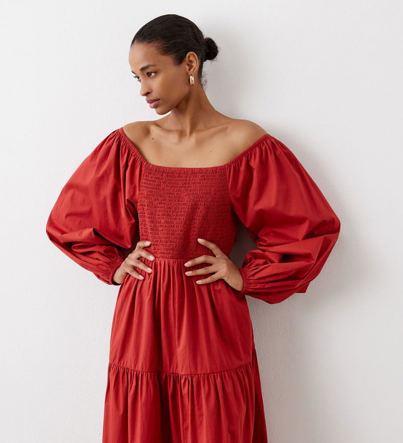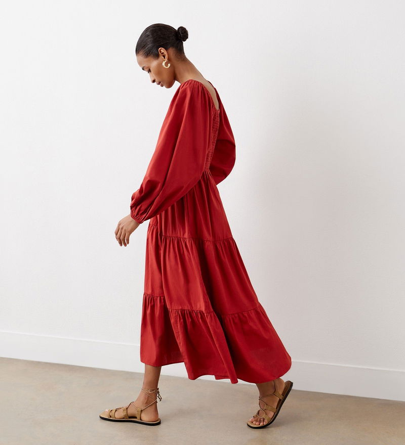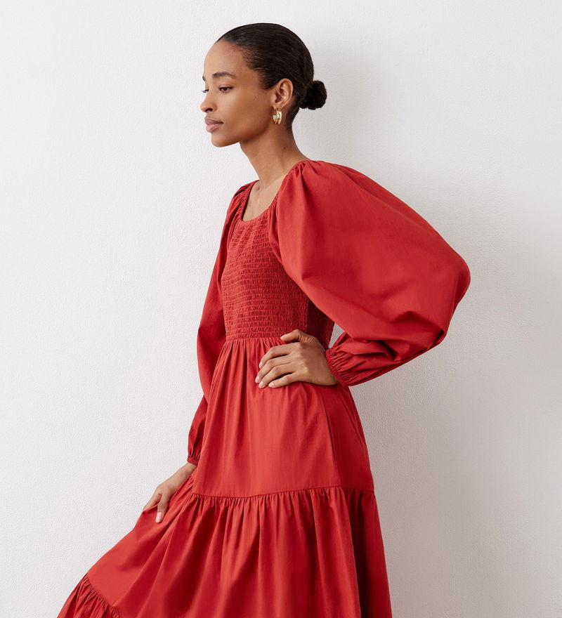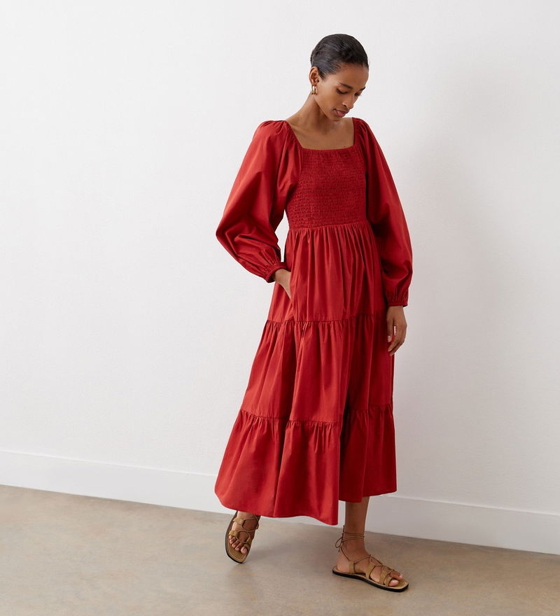 Lauretta is a tiered midi dress crafted from 100 per cent cotton. A shirred bodice makes for a comfortable fit, while the long sleeves and elasticated cuffs add to the fit and flare style. Note also the square neckline.