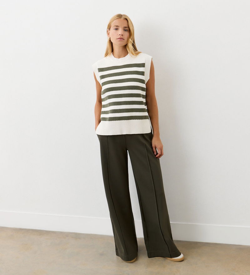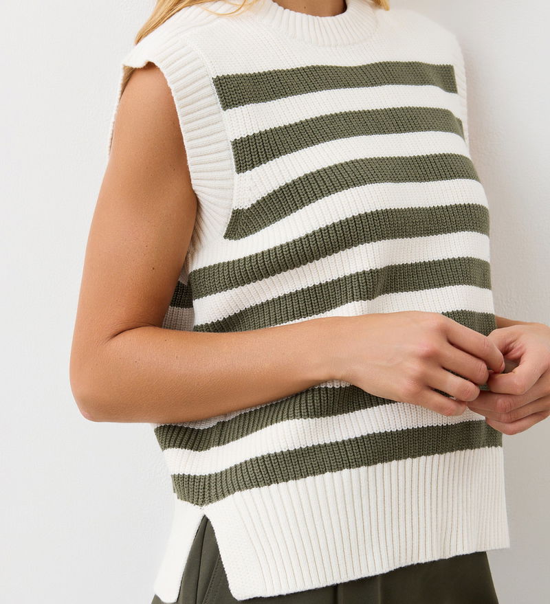 Crafted from a heavy knit with a crew neck, Lexi is a khaki striped sweater vest perfect for layering. Wear with jeans or trousers.