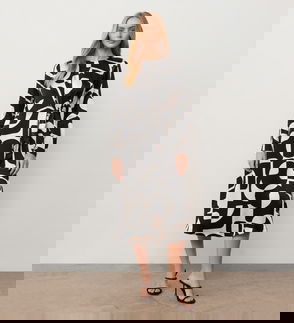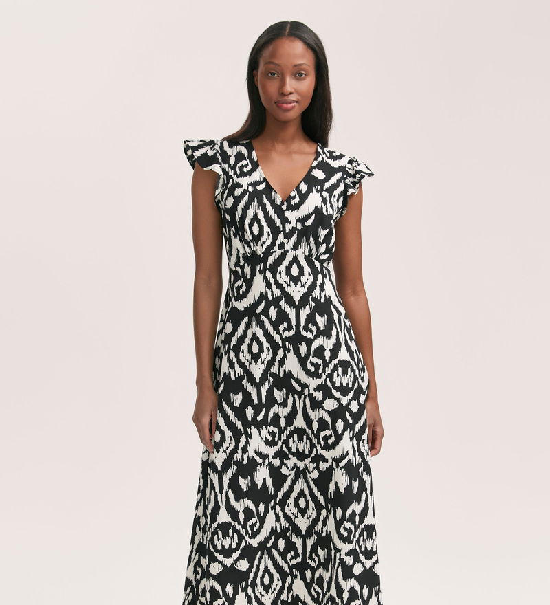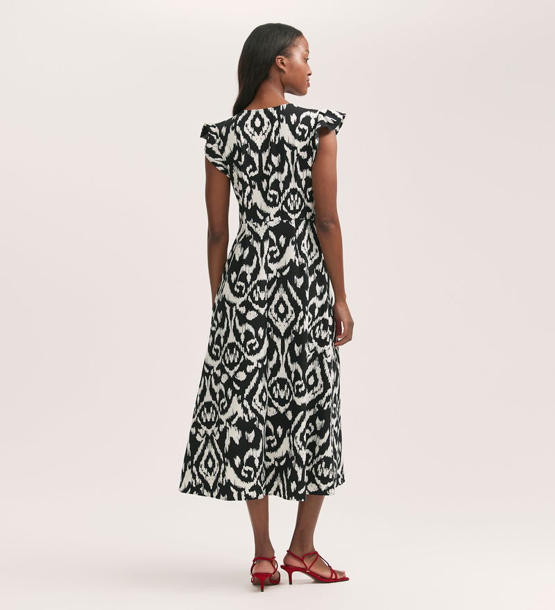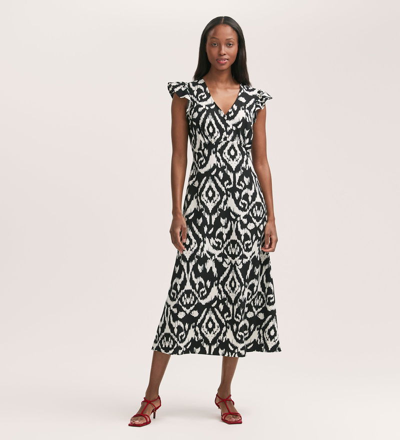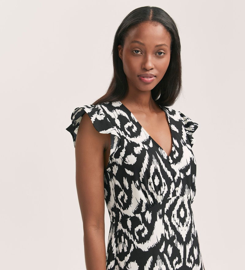 Crafted from our crease-free crepe fabric, Liza is a black ikat midi dress with button detailing and a feminine v-neck. She also features short frill sleeves at the shoulders, creating a flattering shape that's sure to suit every silhouette.