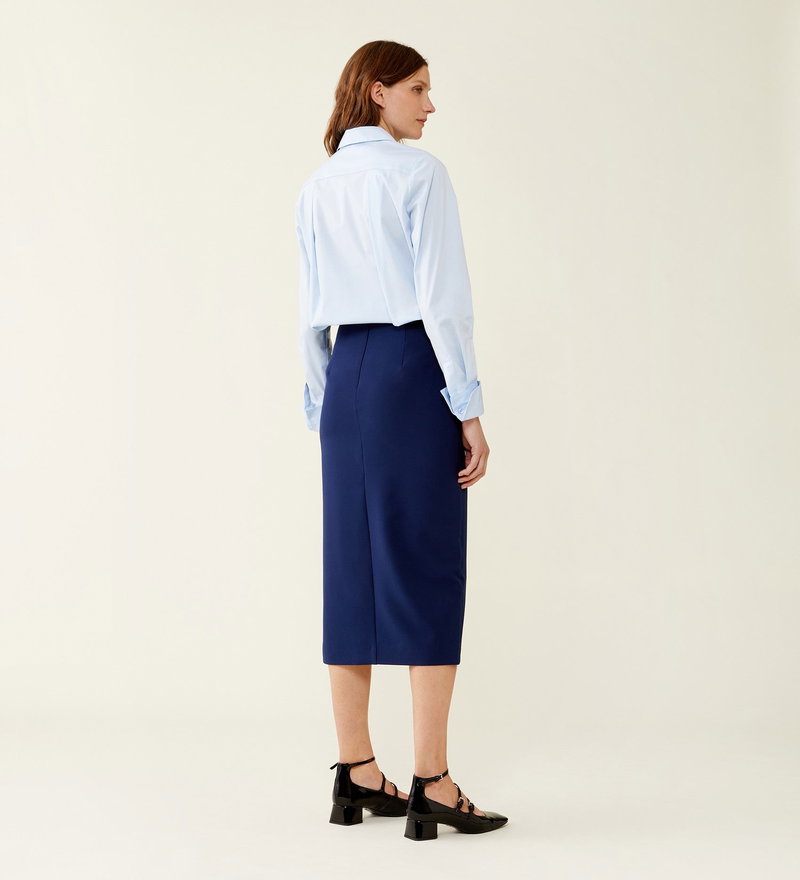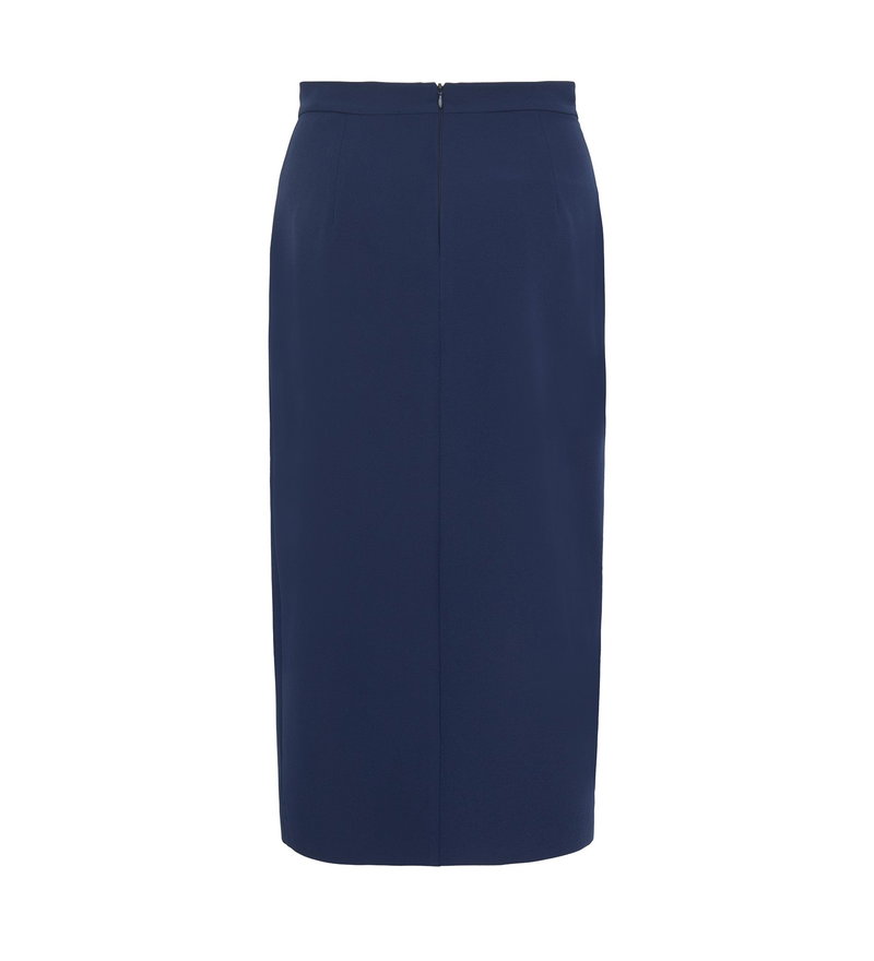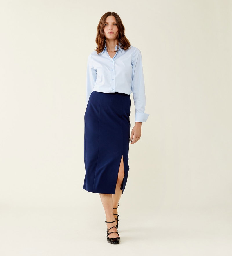 Elegant yet versatile our Logan Skirt in classic navy is our long pencil skirt crafted from soft yet stretchy fabric that flatters every silhouette. With a elegant slit that shows just the right amount of leg, wear yours to the office or after work drinks. Pair with our Daisy Shirt and our Kaiya Jacket to complete this stylish outfit.