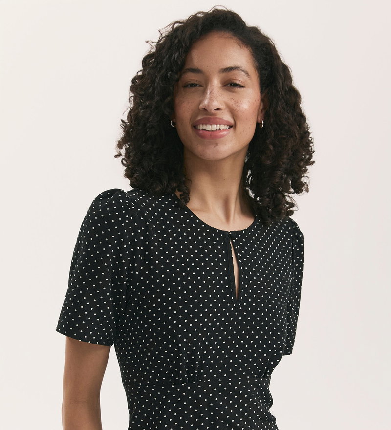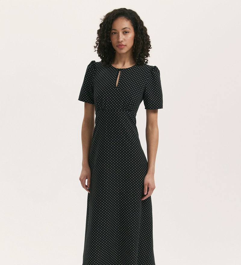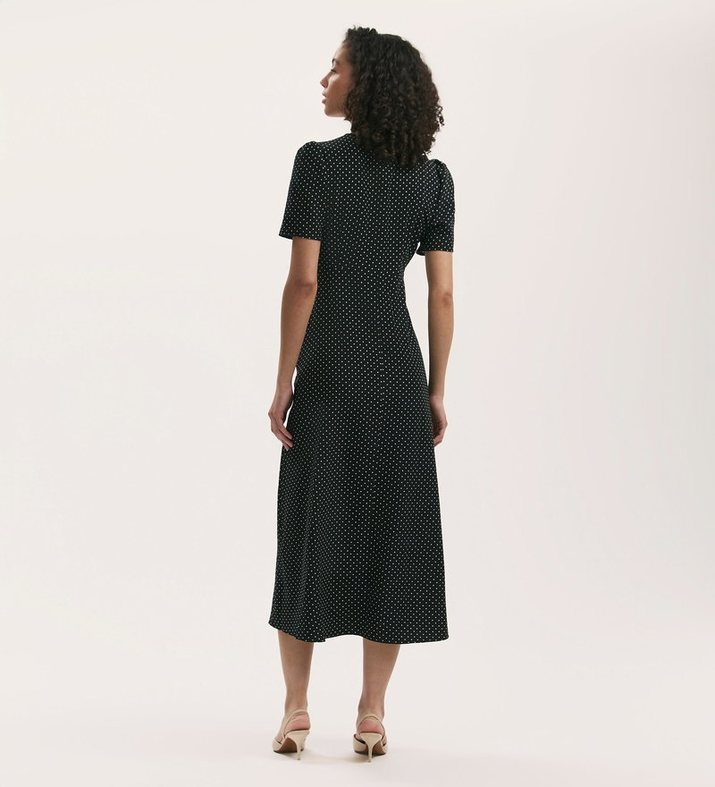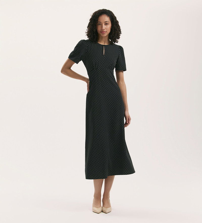 Marie Black Polka Dot Crepe Midi Tea Dress