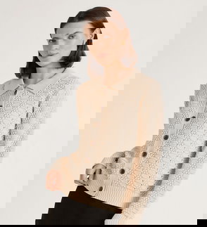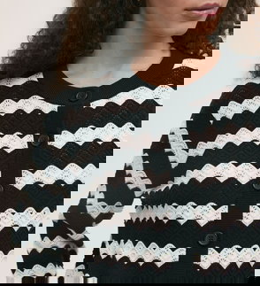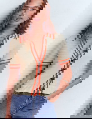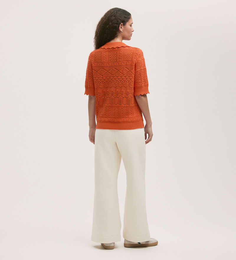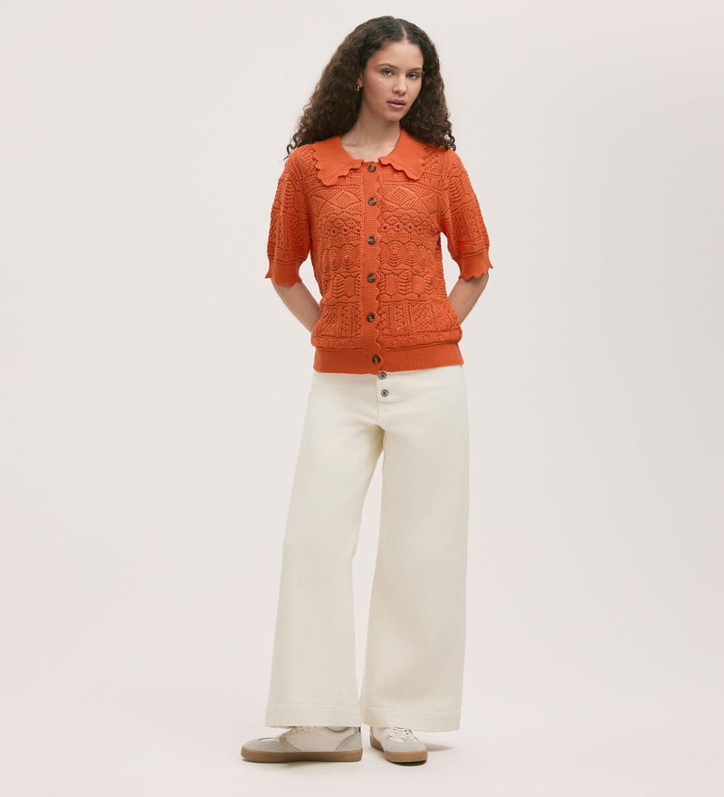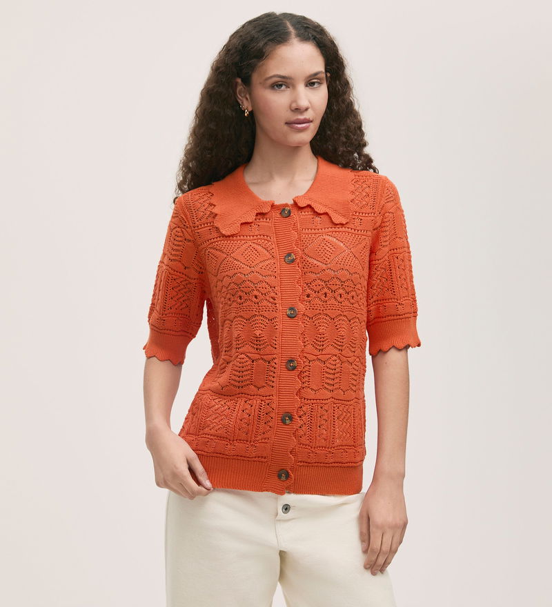 We love this scallop ribbed detailing on the collar and cuffs of Marlowe, our orange button-up crochet cardigan. She has short sleeves and a ribbed detail hemline.
