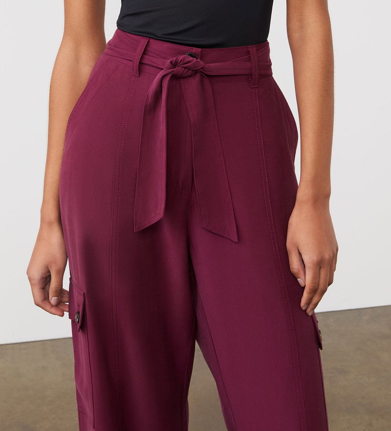 Cargo in style with pockets on the side of the leg, our merlot red wide-leg Maxine trousers are full-length with seam detailing and a tie waist.