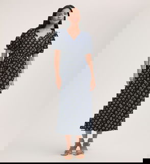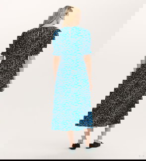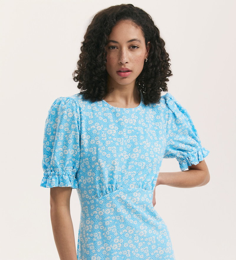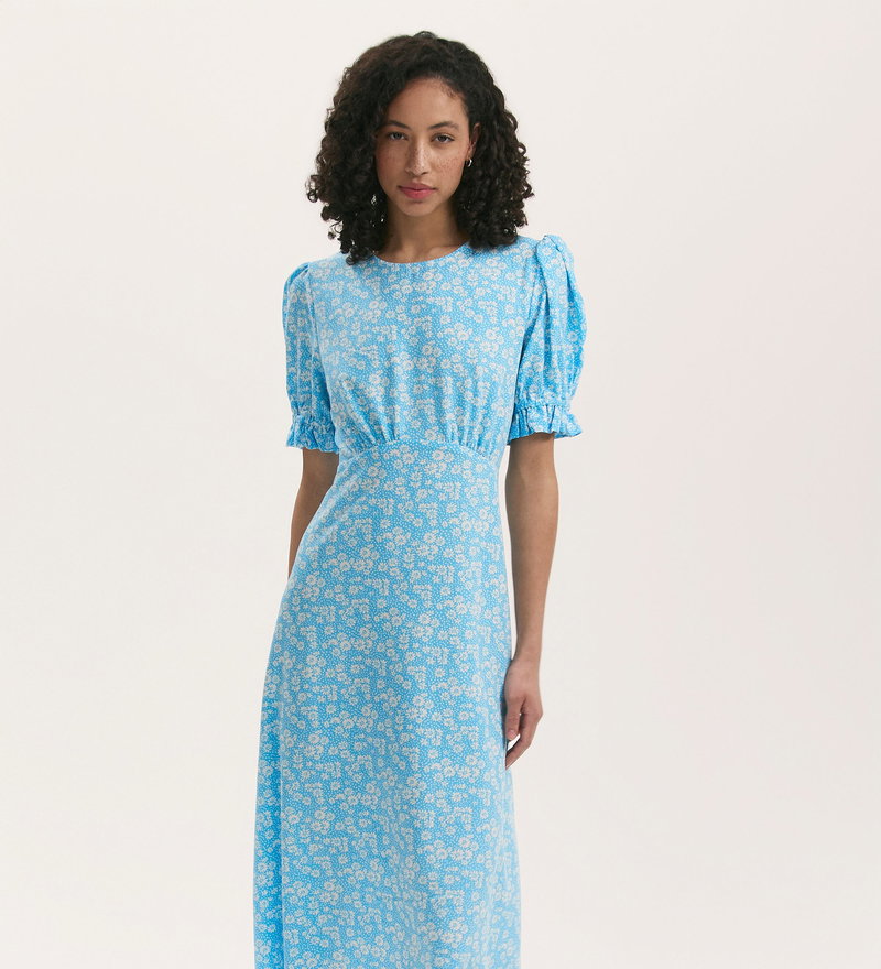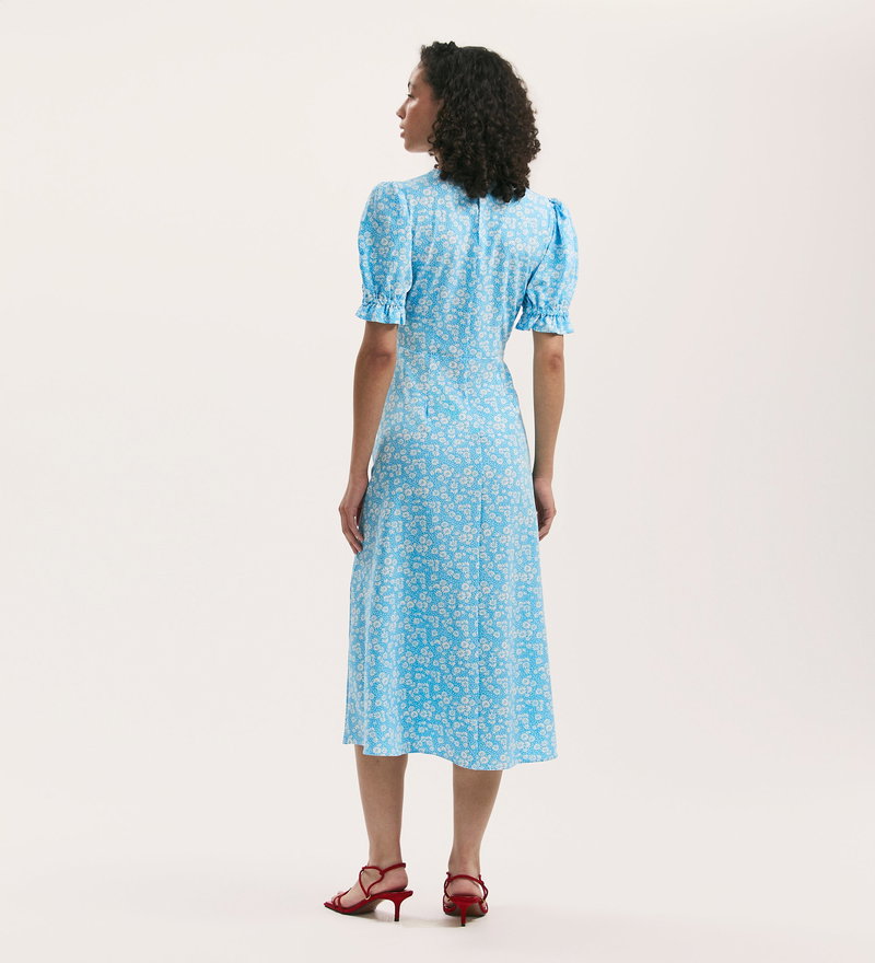 Crafted from crepe for an easy elegant look, Mela is a light blue floral midi tea dress that will see you through any occasion. With an elegant crew neck and empire line waist seam, this dress provides just the right amount of coverage. We love the short sleeves with elasticated cuffs and ruffle detail, and the easy-to-dress rear keyhole fastening.