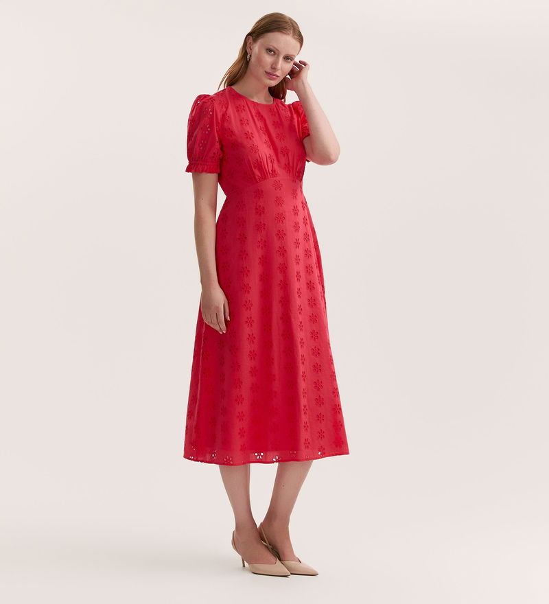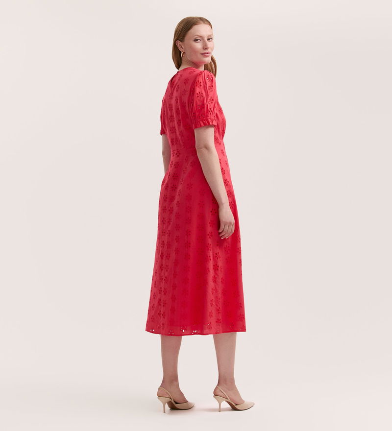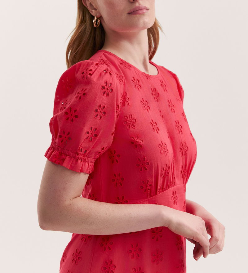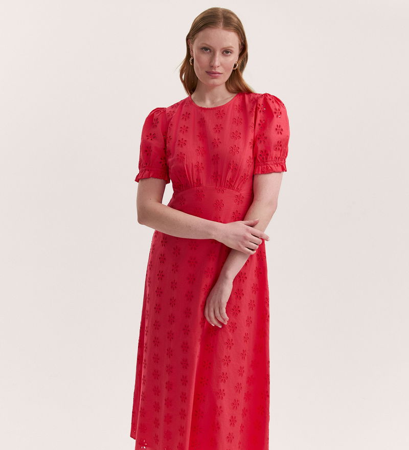 Crafted from breathable cotton, Mela is a versatile coral embroidered midi tea dress designed for effortless elegance. The flattering empire waist seam and elegant crew neck provide a refined silhouette, while short sleeves with elasticated cuffs and delicate ruffle accents add a feminine touch. Finished with an easy-to-dress rear keyhole fastening, Mela is the perfect choice for any occasion, from daytime events to evening gatherings.
