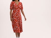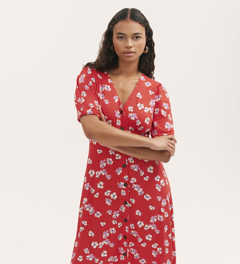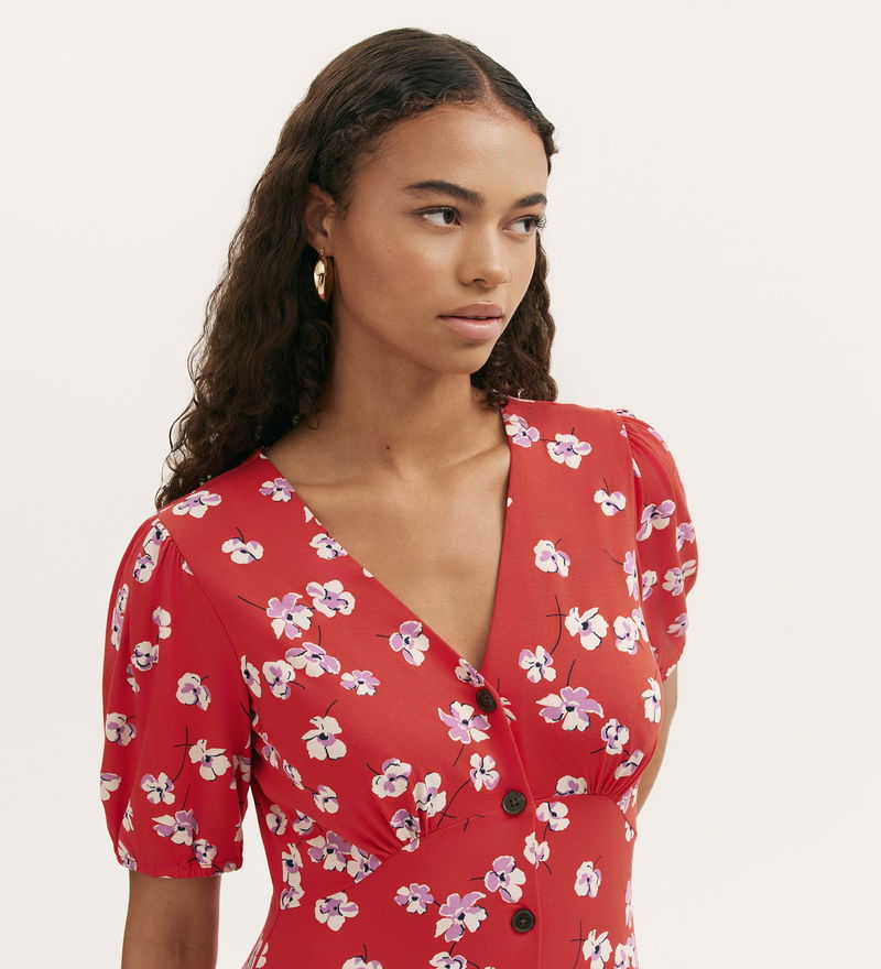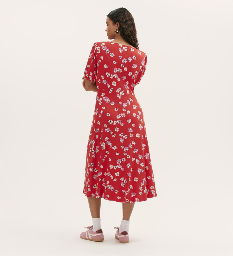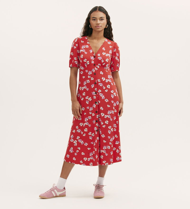 Milena is a red floral midi dress that blends classic design with modern comfort. Featuring a flattering V-neck and button-down front, she offers timeless style with every wear. The short sleeves and gathered bust add subtle detail, while the soft jersey fabric ensures a relaxed and comfortable fit.