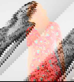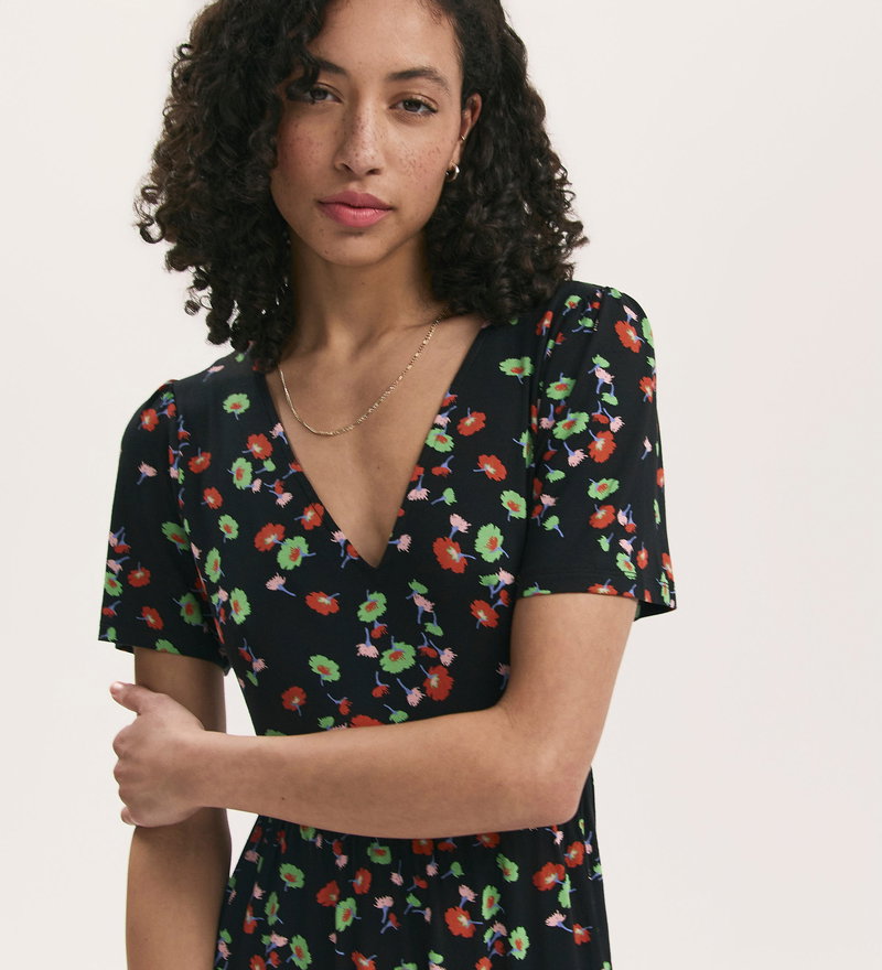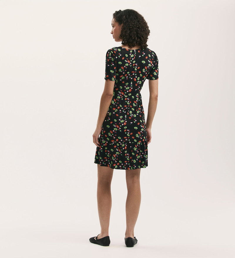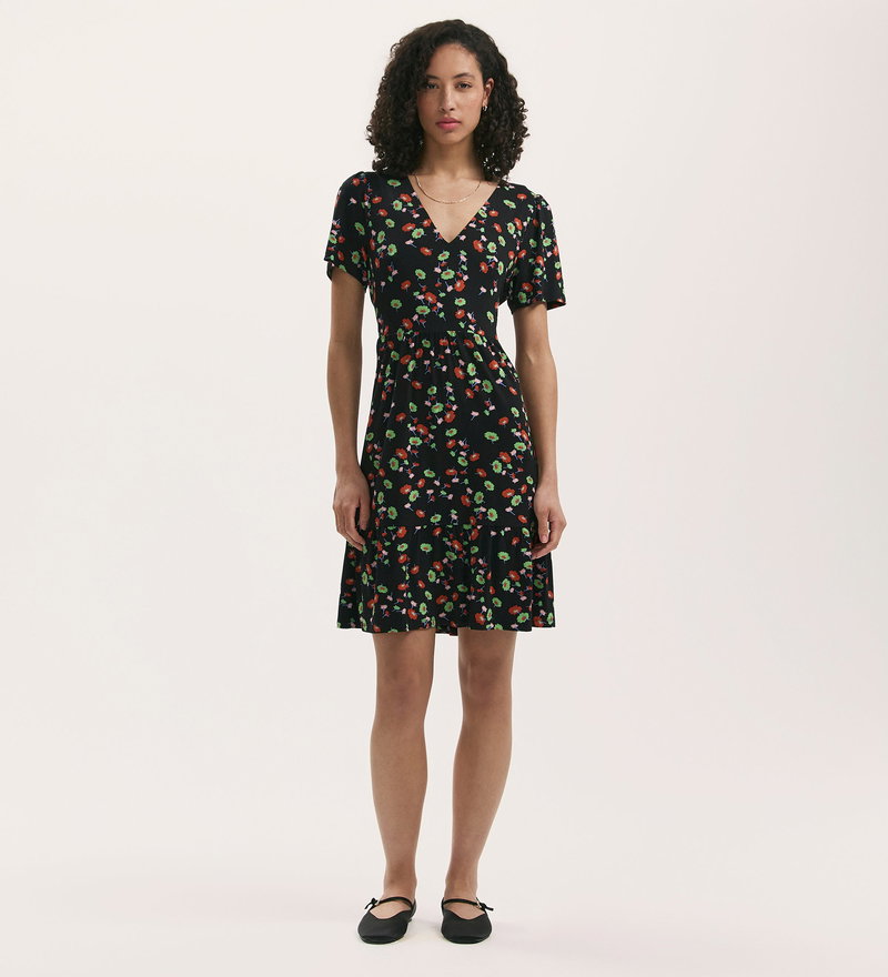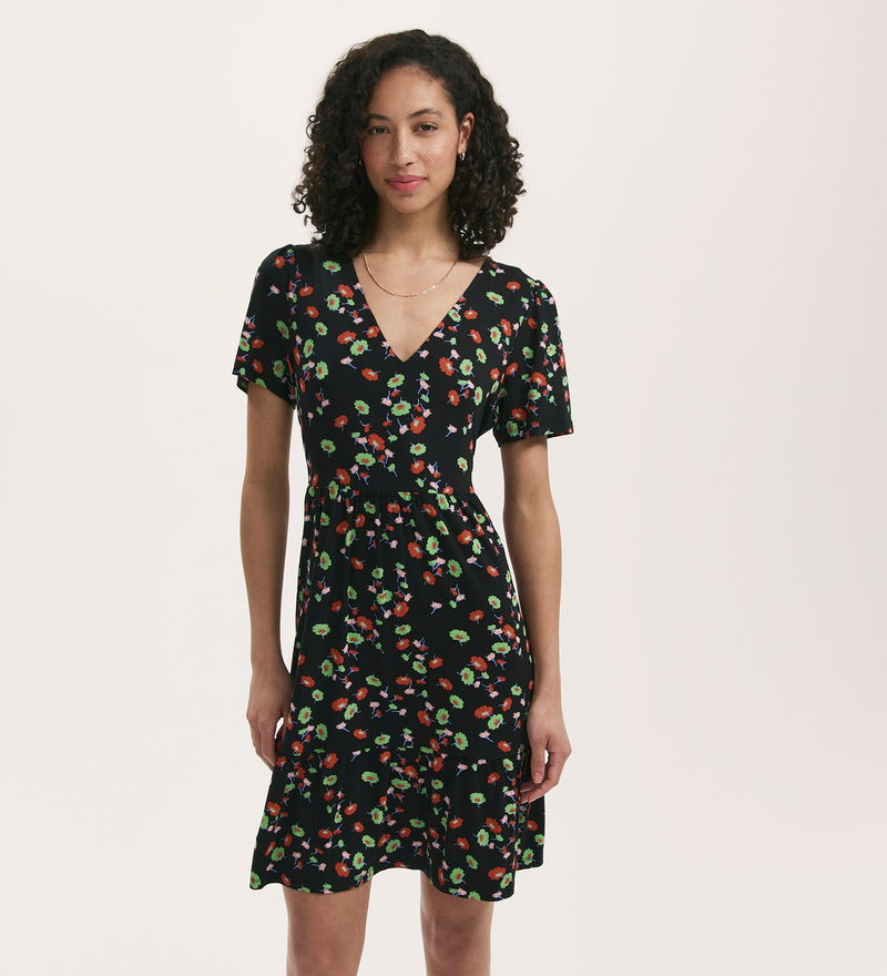 Crafted from our jersey fabric, Misha is a black floral short v-neck dress with a tiered skirt and short sleeves. Her waist offers a figure-flattering fit.