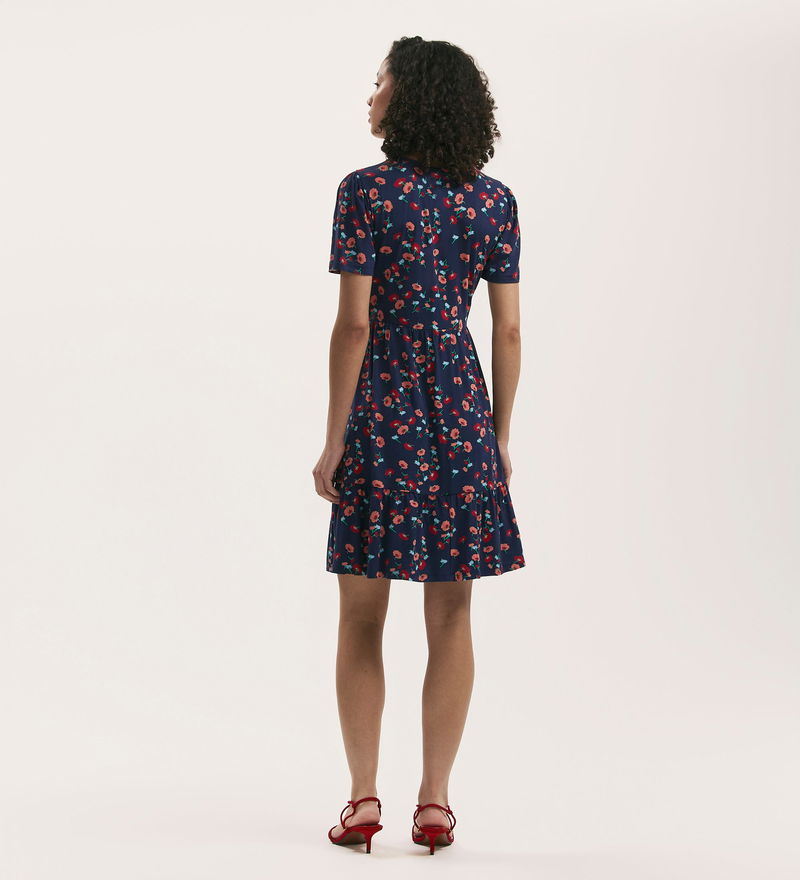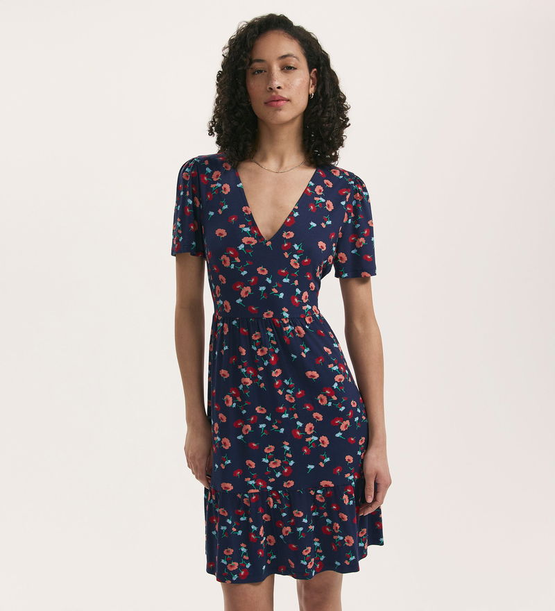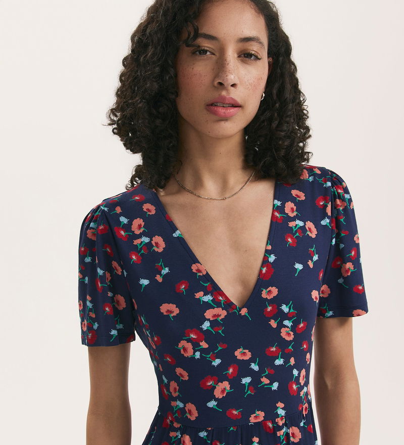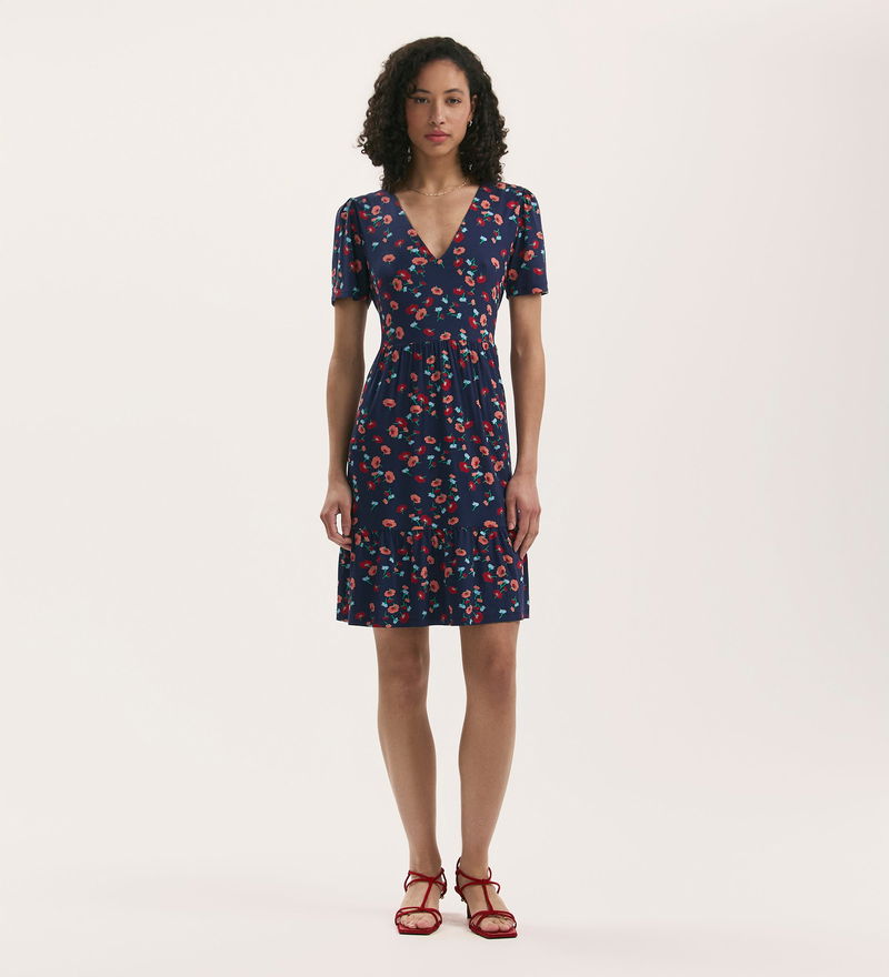 Crafted from our jersey fabric, Misha is a navy floral short v-neck dress with a tiered skirt and short