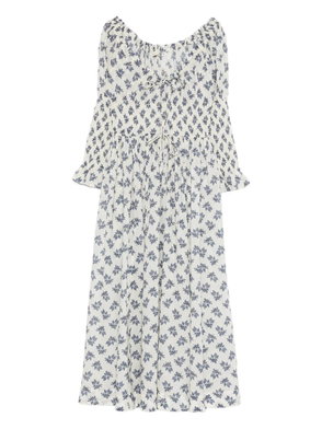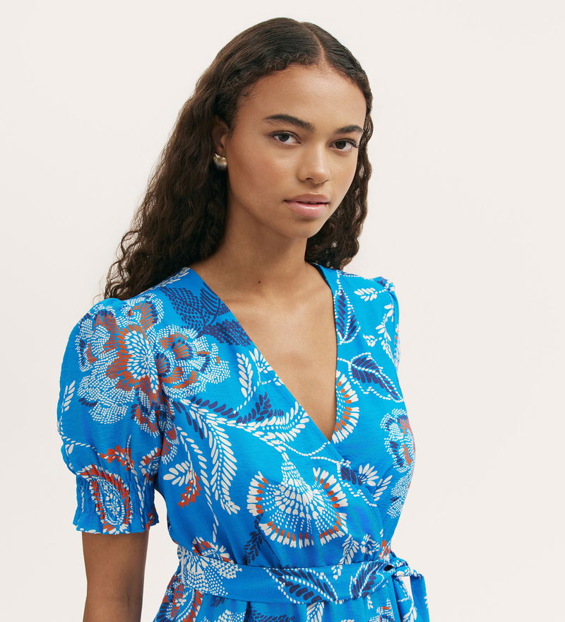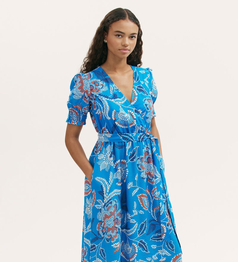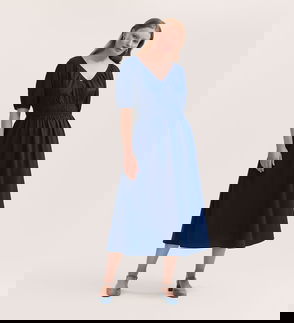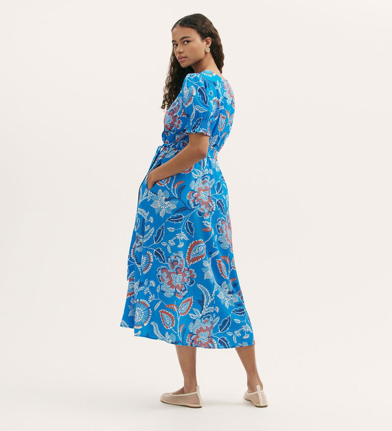 Softly structured in a relaxed fit and effortlessly feminine, Nicoletta is a V-neck midi dress with a wrapped-front bodice that creates a flattering shape. An elasticated shirred waist and self-tie belt define the silhouette, complemented by short sleeves finished with shirred cuffs. Nicoletta also features practical side pockets.
