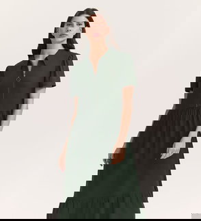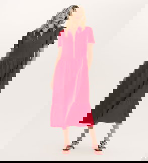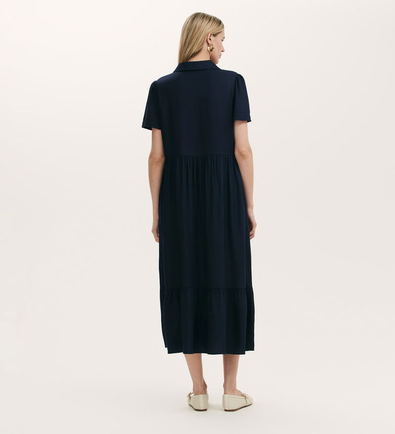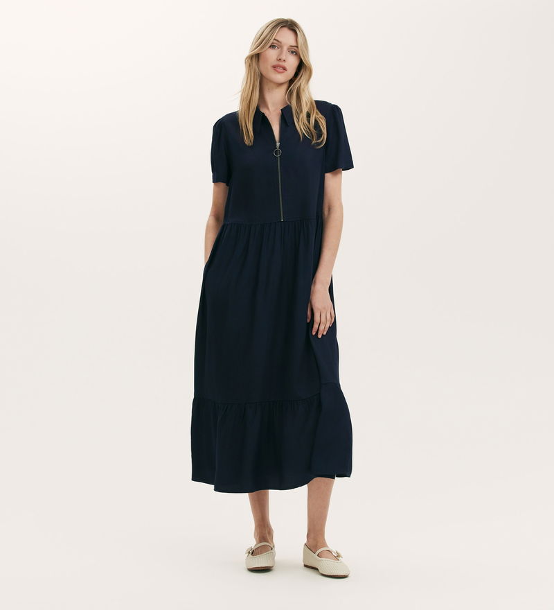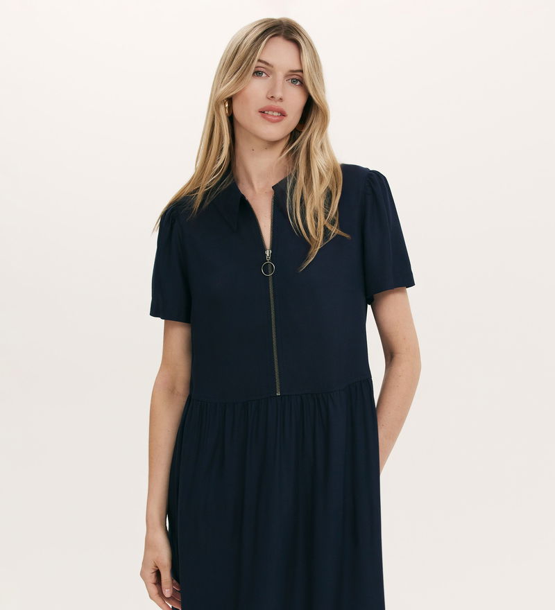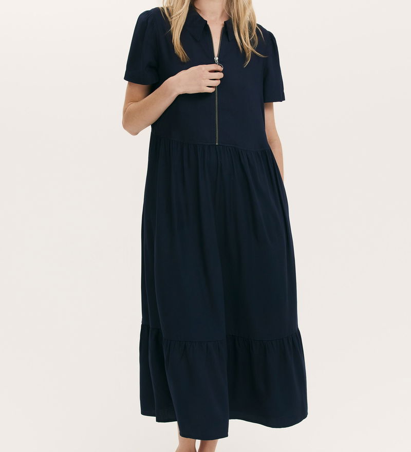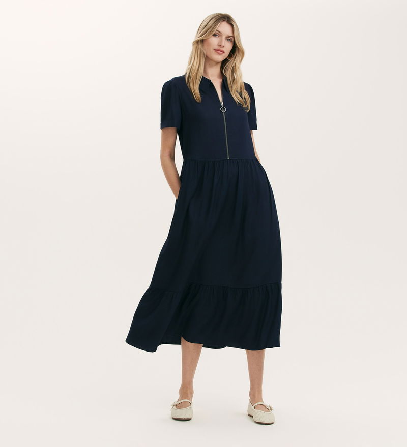 A navy collared midi shirt dress with an easy zip front, Orion features short sleeves and is a relaxed fit style. She also features a tiered hemline and functional pockets.
