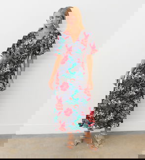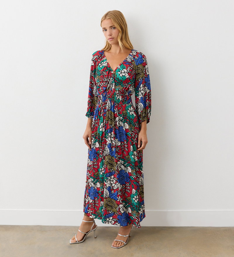 Piper is a red floral midi smock dress crafted from breathable cotton, offering a soft yet structured feel. Featuring three-quarter length sleeves and a gathered v-neck, this feminine style is designed for effortless elegance. The shirred waist detail enhances the silhouette, ensuring a flattering fit for every figure. Perfect for versatile styling, Piper is a timeless wardrobe staple.
