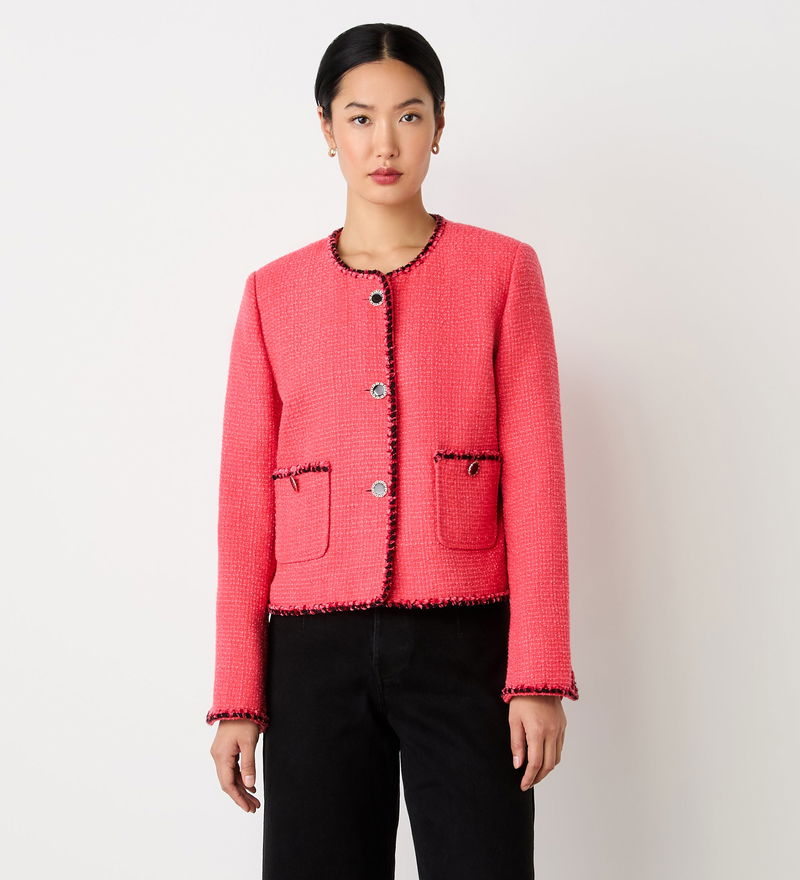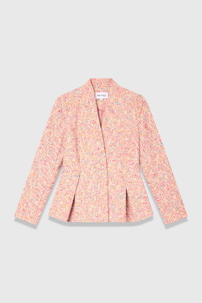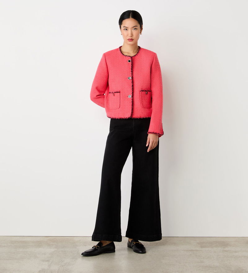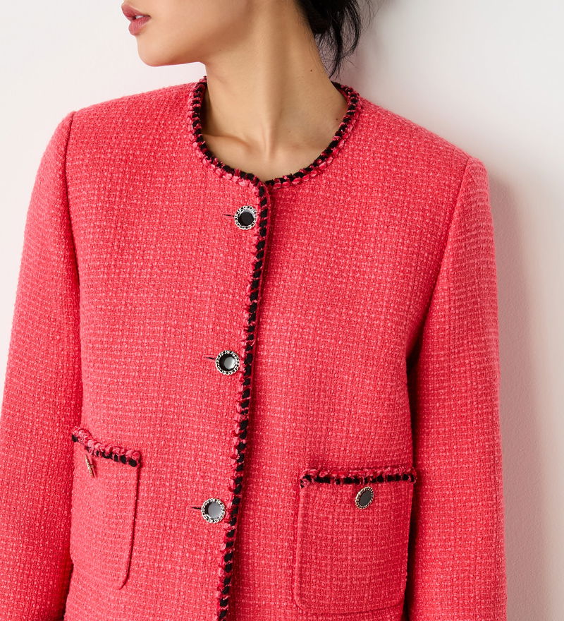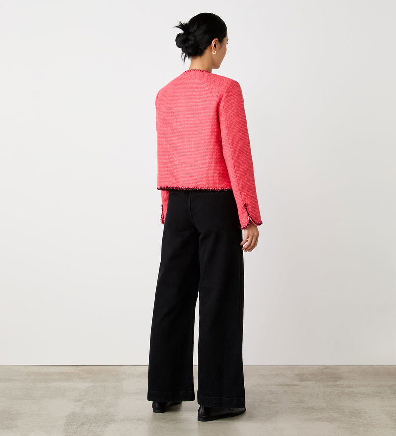 Polly is the epitome of effortless elegance. Crafted from decorative tweed, this cropped jacket boasts a refined round neckline, long sleeves with subtle slit cuffs, and statement black-and-gold button fastenings. Finished with a striking contrast trim, Polly is your go-to piece for adding a polished touch to any outfit, instantly transforming it into a timelessly chic look.