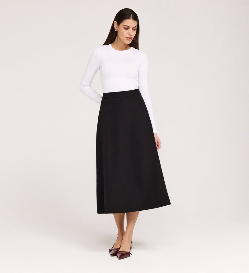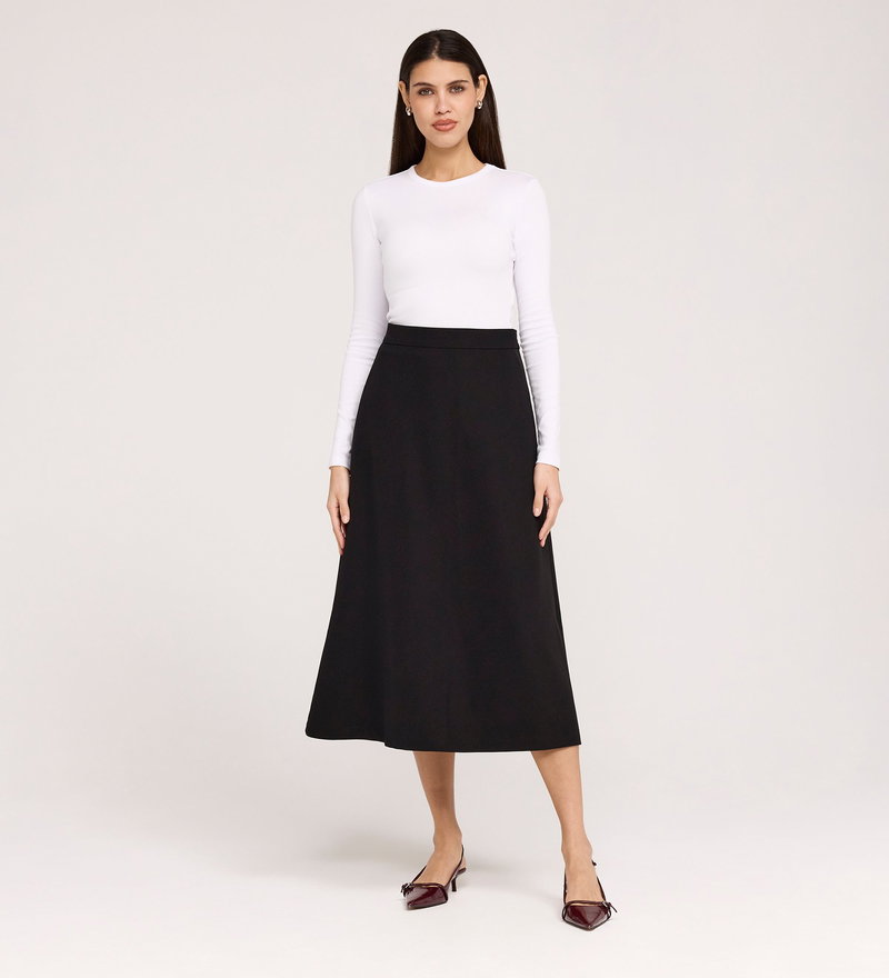 Ramona is a graceful midi skirt defined by its fluid flare and timeless appeal. Designed with a smooth waistband, she sits neatly at the waist before falling into a softly draped silhouette. Crafted from our signature crepe fabric, Ramona moves with ease, making her a versatile piece that transitions effortlessly from work to weekend.