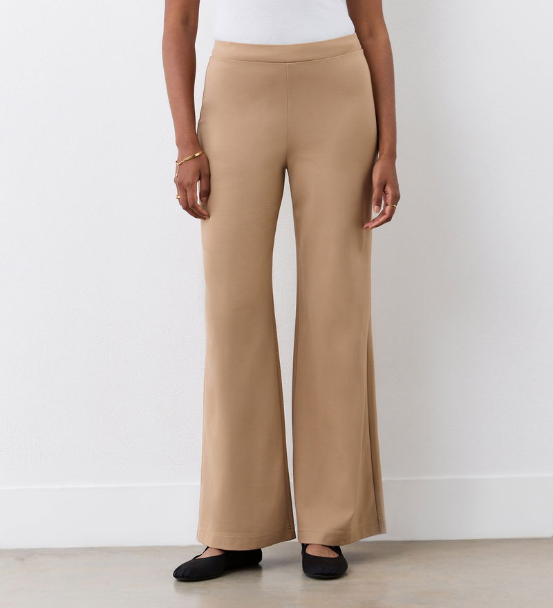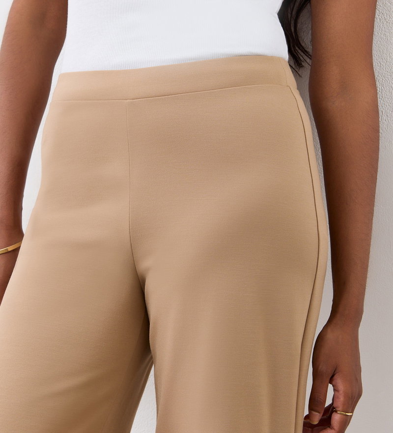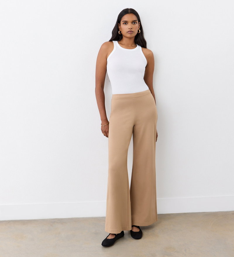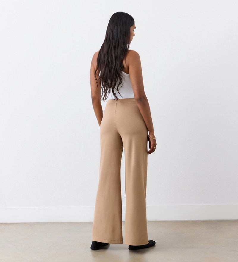 Meet Reyna, our camel wide-leg trousers, a key piece for comfort and style throughout the seasons. In a thick Ponte jersey, they have loose, wide legs and are flatteringly high-waisted. We suggest pairing with trainers or with heels.
