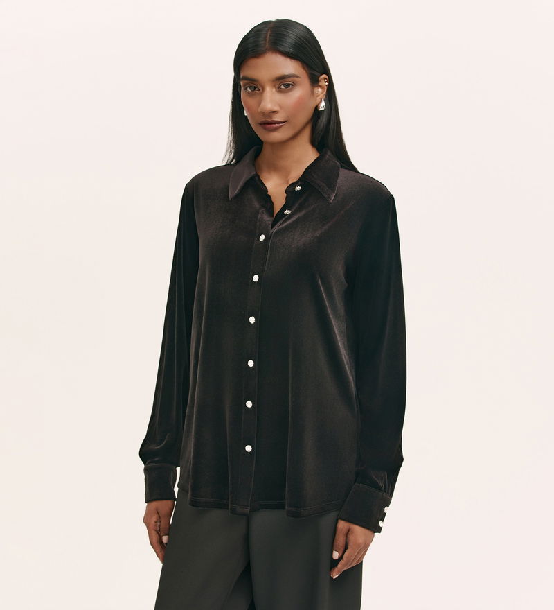 The Sayge Shirt is designed to add an element of luxury to your wardrobe. Crafted from sumptuous velvet fabric, this shirt features a classic collar and is buttoned through with dazzling contrast buttons. The long sleeves are finished with refined cuffs, complete with a matching double button detail. An essential piece for sophisticated day-to-evening styling.