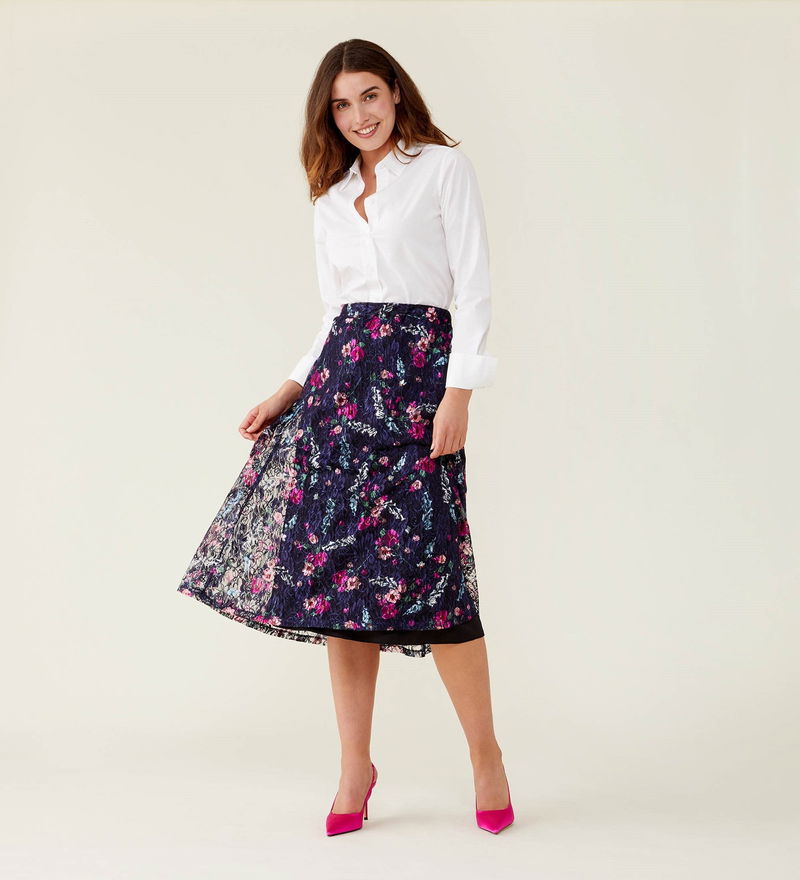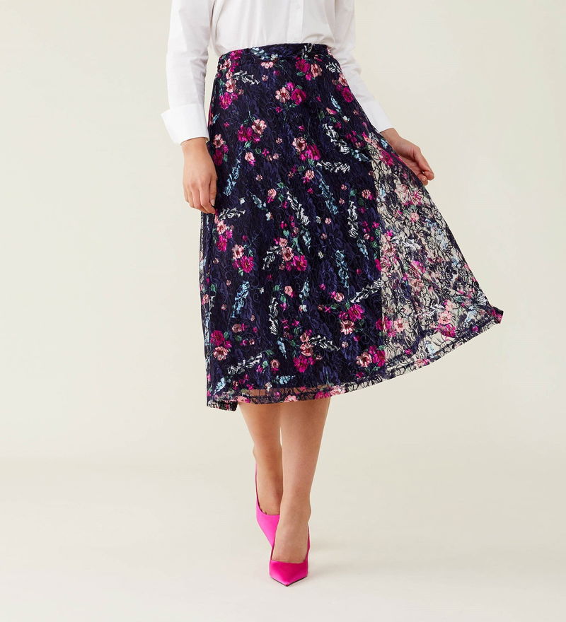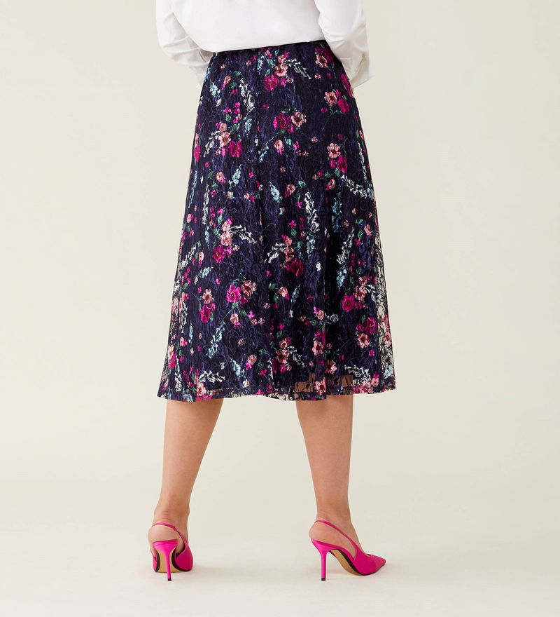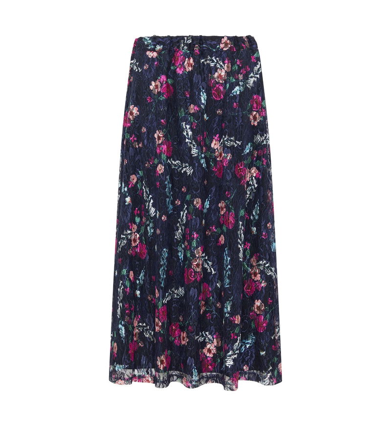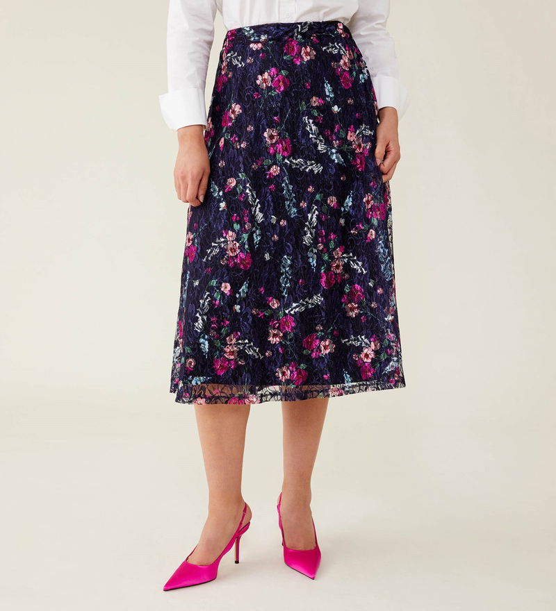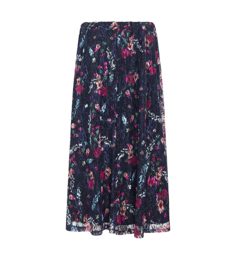 Crafted from luxurious lace, our navy floral steph skirt has arrived in perfect time for party season. Midi in length, Steph can be paired with a blouse or turtleneck, heels or boots.