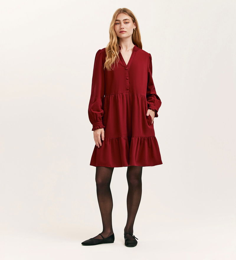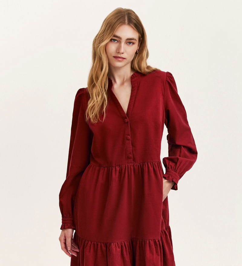 Verona is a charming mini dress that blends classic details with relaxed comfort. Crafted from soft corduroy, she features a flattering V-neckline accented by a delicate frilled collar and button-front detailing. Long sleeves with cuffs and a side seam zip add polish, while practical side pockets and a tiered skirt bring effortless style and ease to your everyday wardrobe.