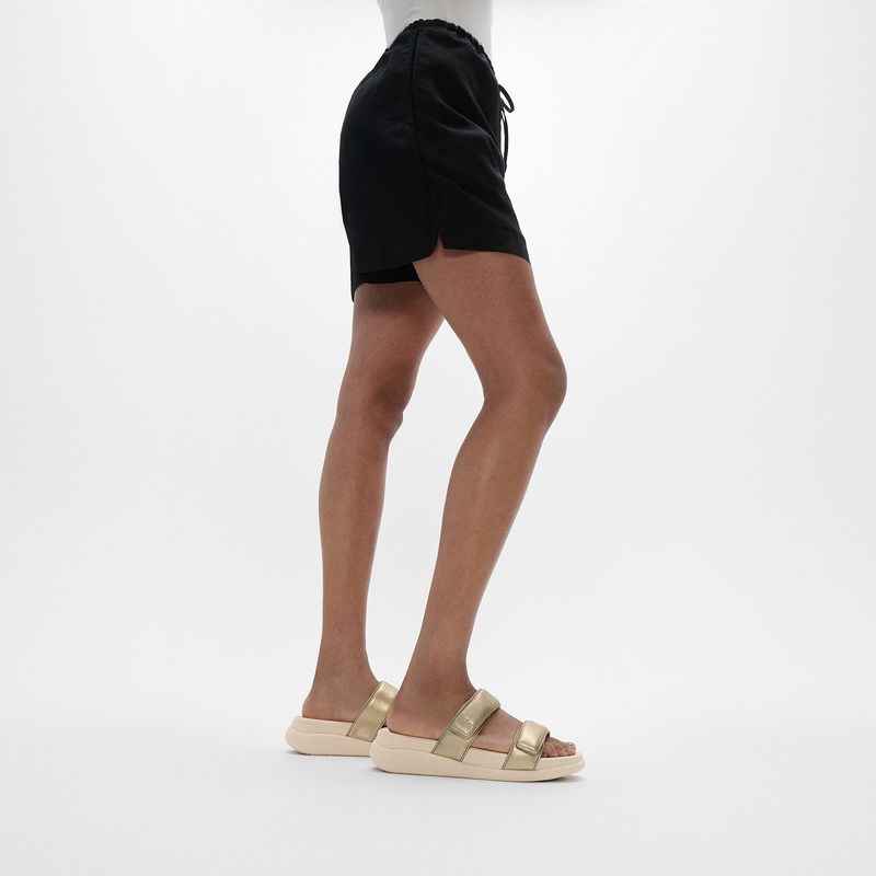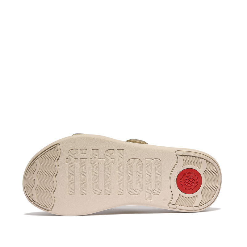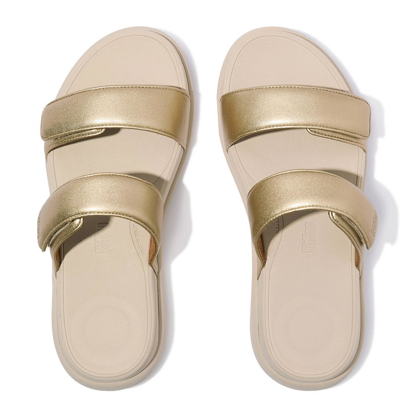 With our F-Mode Go we've created a simple streamlined sandal infused with our signature comfort. Chunky soled, featuring a modern ‘stripped-back' design and fluid lines. This two-bar slide in padded pillow-soft metallic faux-leather. Easy touch fastenings customize the fit. Naked footbeds give the original feel of our first sandals - your feet enjoying direct contact with our cushioned triple-density Microwobbleboard™ midsole (in a new ultra-light/flexible two-layer version). Essential for everyone.