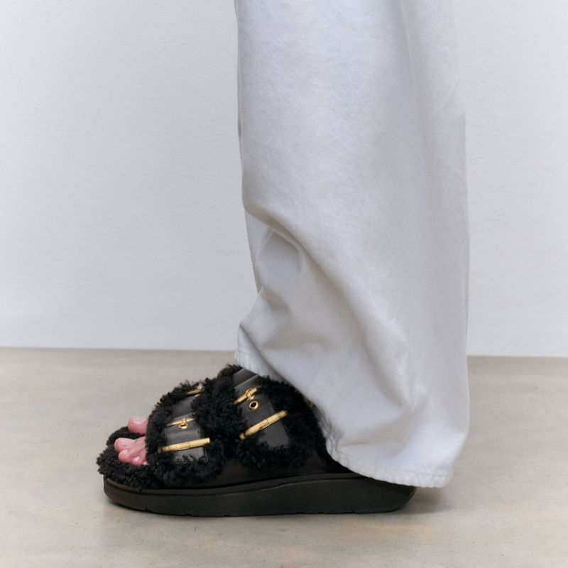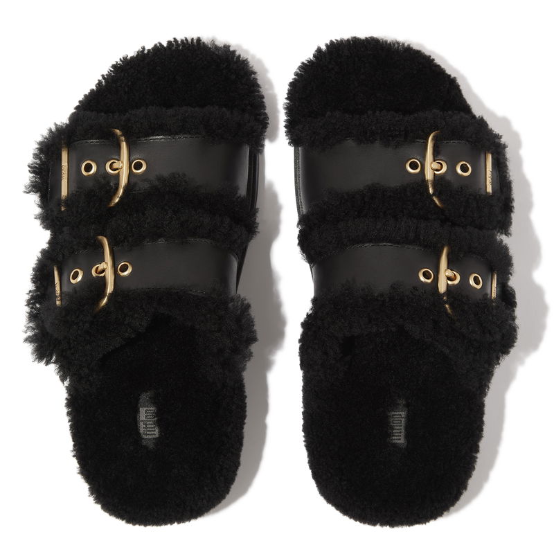 A gorgeously fluffy statement version of our modern-luxe sandals to cold-weatherproof you in style. These boast a leather/shearling two-bar upper on a chunky, yet light, sole. Lined in the same thick warm curly shearling - breathable, thermo-regulating and ultra soft. Curvy brushed-gold buckles customize the fit. On our cushiony Microwobbleboard™ midsole, so you not only look like you're walking on clouds you feel like it too. Wear as plush slippers indoors or cozy (and scene-stealing) slides outdoors.