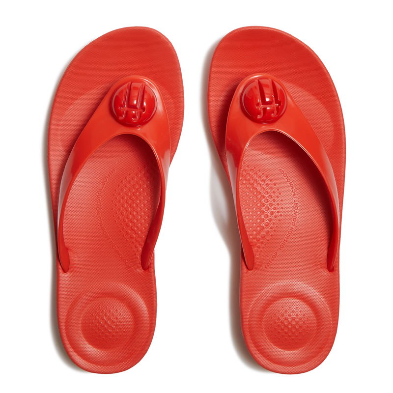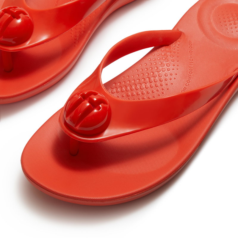A wide, glossy front strap is studded with subtly logo-embossed button detailing to add a polished touch to the classic flip-flop shape.