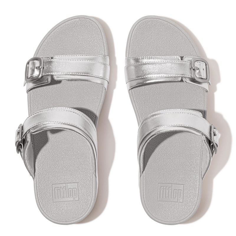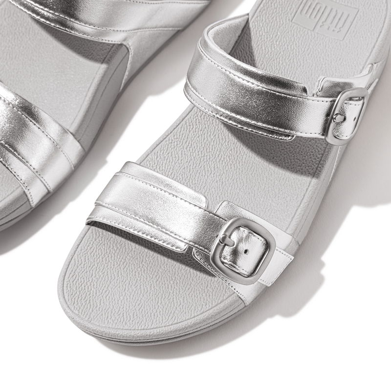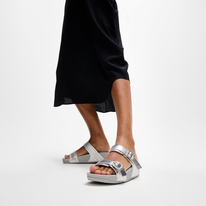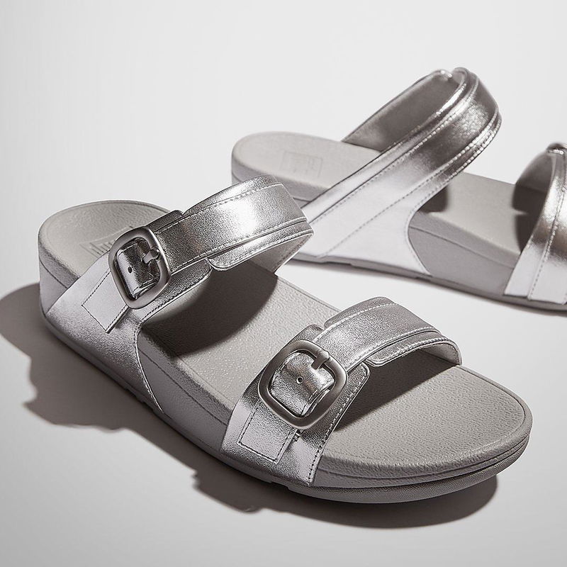 This reworking of our bestselling Lulu slides combines their classic style with a customizable fit - thanks to a shiny curvy buckle on both straps. Softly padded. Crafted in shimmering metallic leather. On our triple-density Microwobbleboard™ midsoles, biomechanically engineered for pressure diffusion, impact reduction, and unbeatable cushioning and comfort. A perfect mix of polished and practical. Buckles are 100% recycled zinc.
