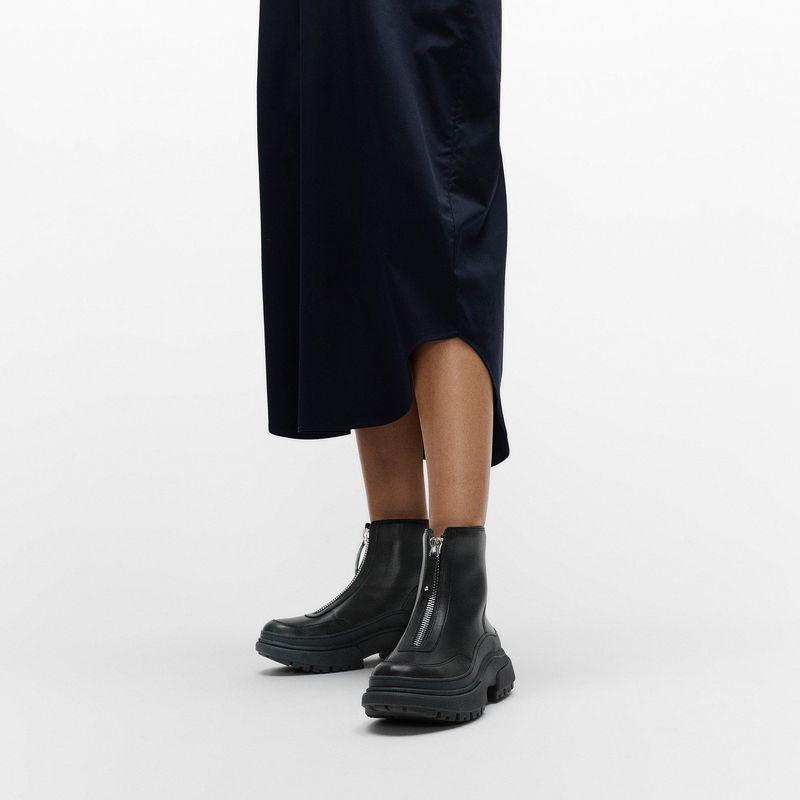 Our Wylder teams luxe directional style with the ultimate stompy statement, yet light, sole. This sleek ankle boot sports a chunky front zip (and leather zip pull) for bold detail and easy on/off. Crafted in soft premium leather, with a webbing back strip/pull tab. A wraparound rubber panel keeps out water. On our ultra-comfortable Microwobbleboard™ midsole (this Wylder version offers extra height). Featuring a grippy treaded outsole whose clever design gives a utility look without the weight.