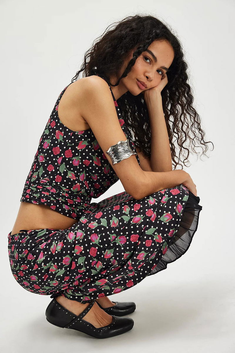 Romanticize your life in this charming midi skirt set from For Love & Lemons, featuring a cropped cowl-neck top and a flirty flounce-hem skirt, both crafted in a coordinating floral and polka-dot pattern, creating the ultimate 2-in-1 ensemble.