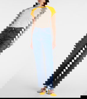 Straight-leg jeans, Denim, Stitched front creases, Belt loops, High-rise cut, Two front slant pockets, Button and concealed zip fastening at front, Folded cuffs, Mid-weight, non-stretchy fabric.