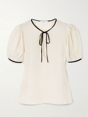 Blouse, Silk-chiffon, Ruffled, Buttoned cuffs, Button fastenings through front, Lightweight, non-stretchy fabric.