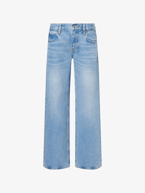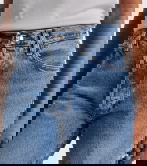 • Mid-rise fit, straight-leg cut, belt loops, five pockets, whiskered and washed finish