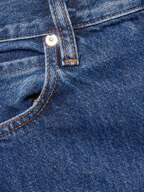 Non-stretch denim jeans. Fading, whiskering, and subtle distressing throughout.