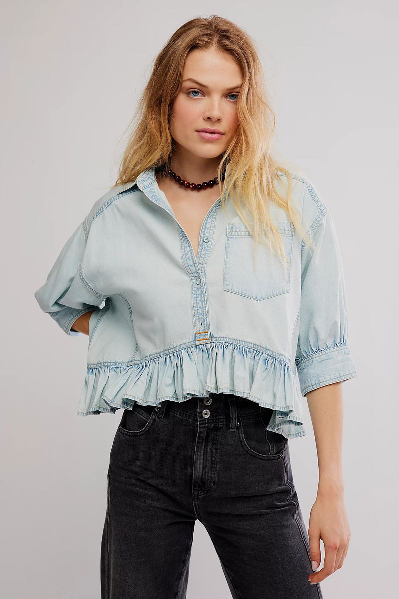 A classic denim shirt with a little something extra, featuring a ruffled hemline and short balloon-style sleeves.
