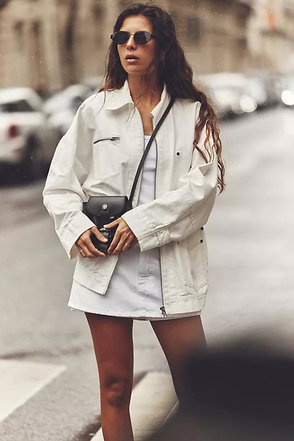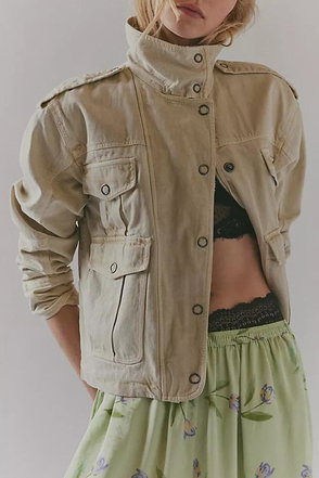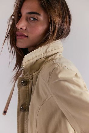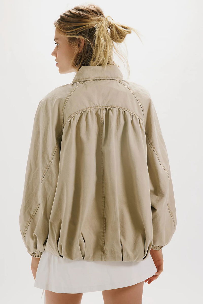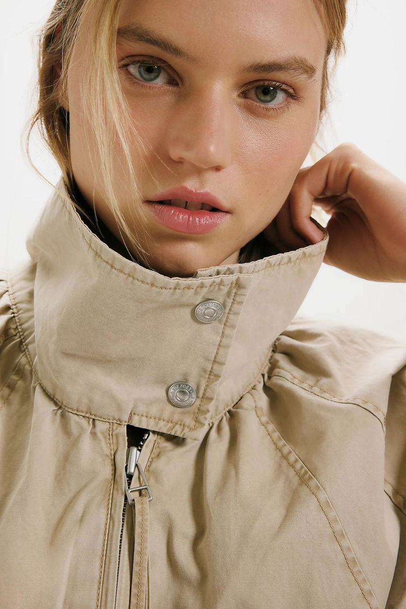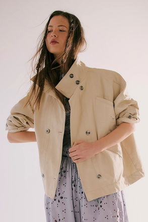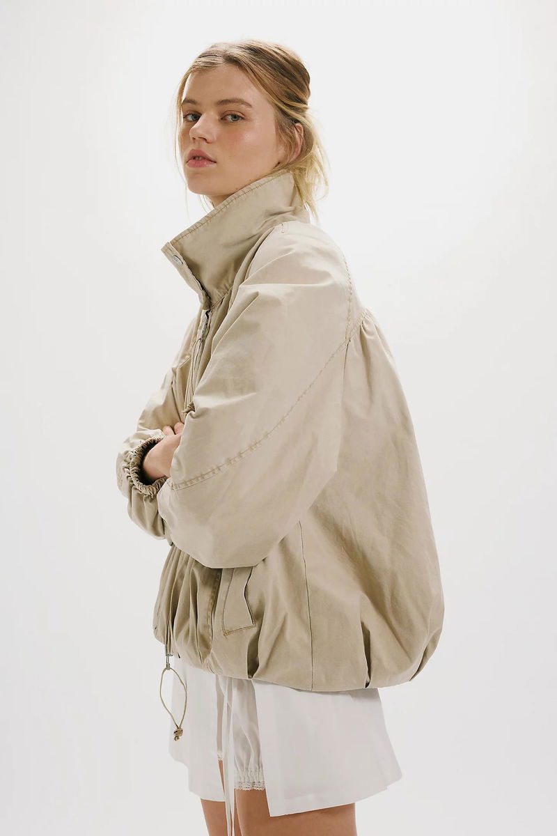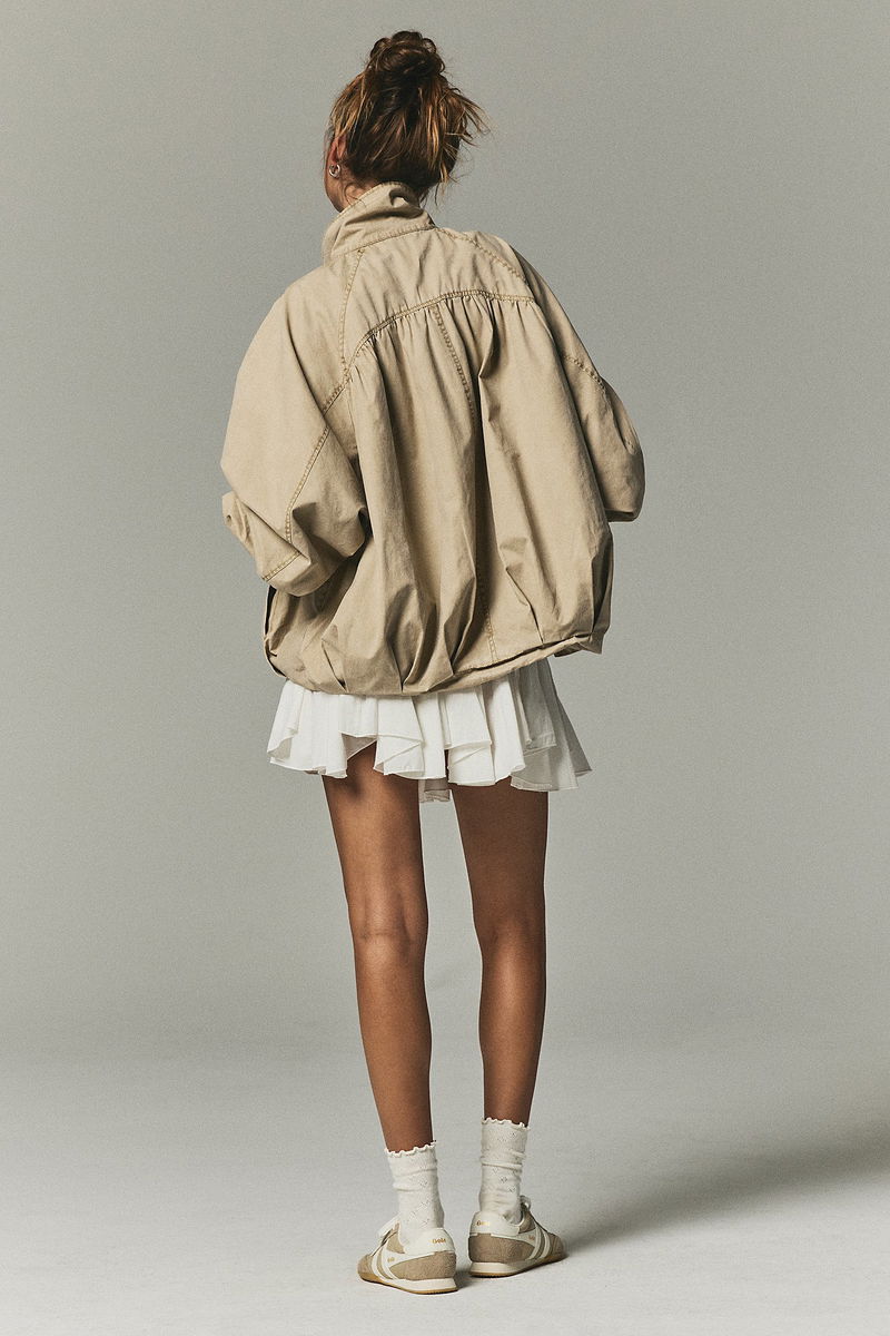 Classic and utility-inspired, this oversized jacket features a slouchy silhouette, a lightweight cotton-blend fabrication, and a timeless funnel-neck collar for added dimension.