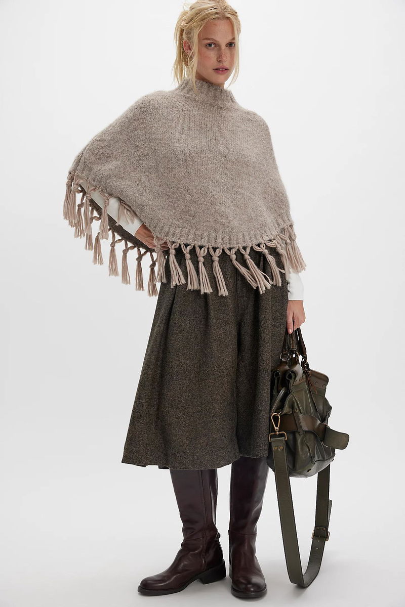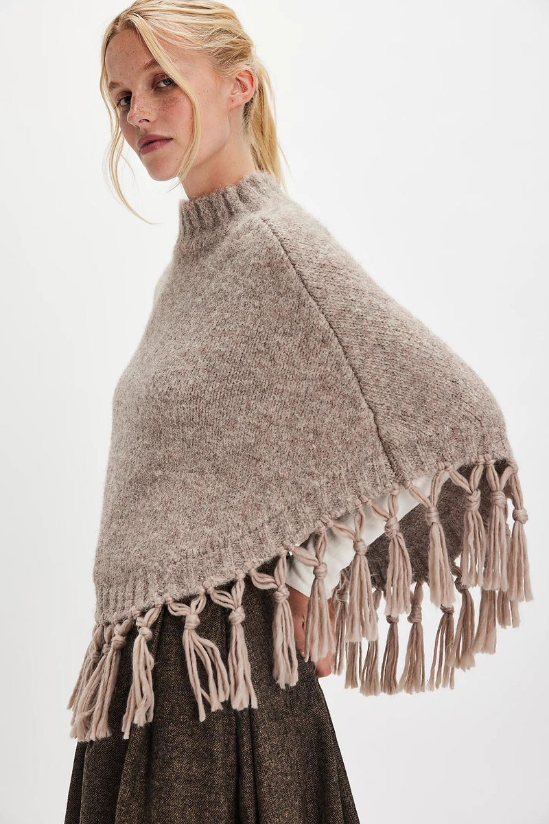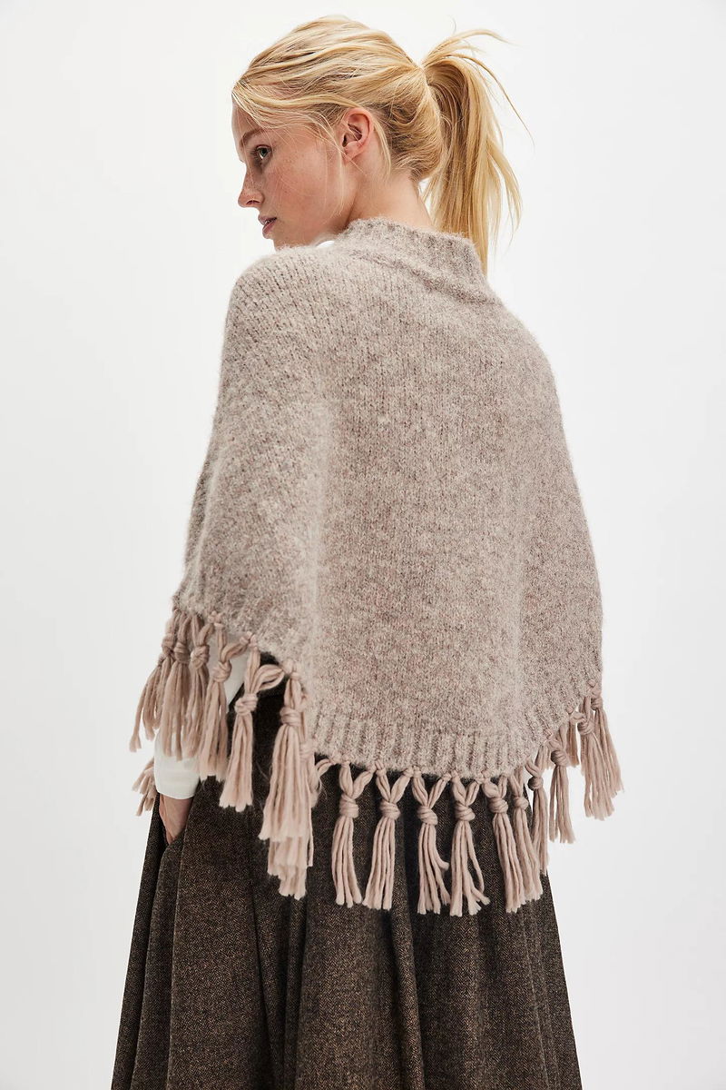 Designed to be your go-to pullover piece all season long, this effortless poncho is featured in a mock-neck style and knit fabrication with defined fringe bottom trim for added dimension.