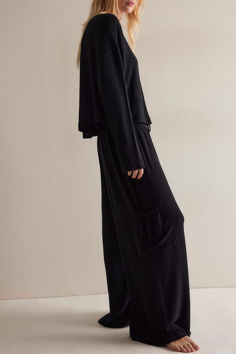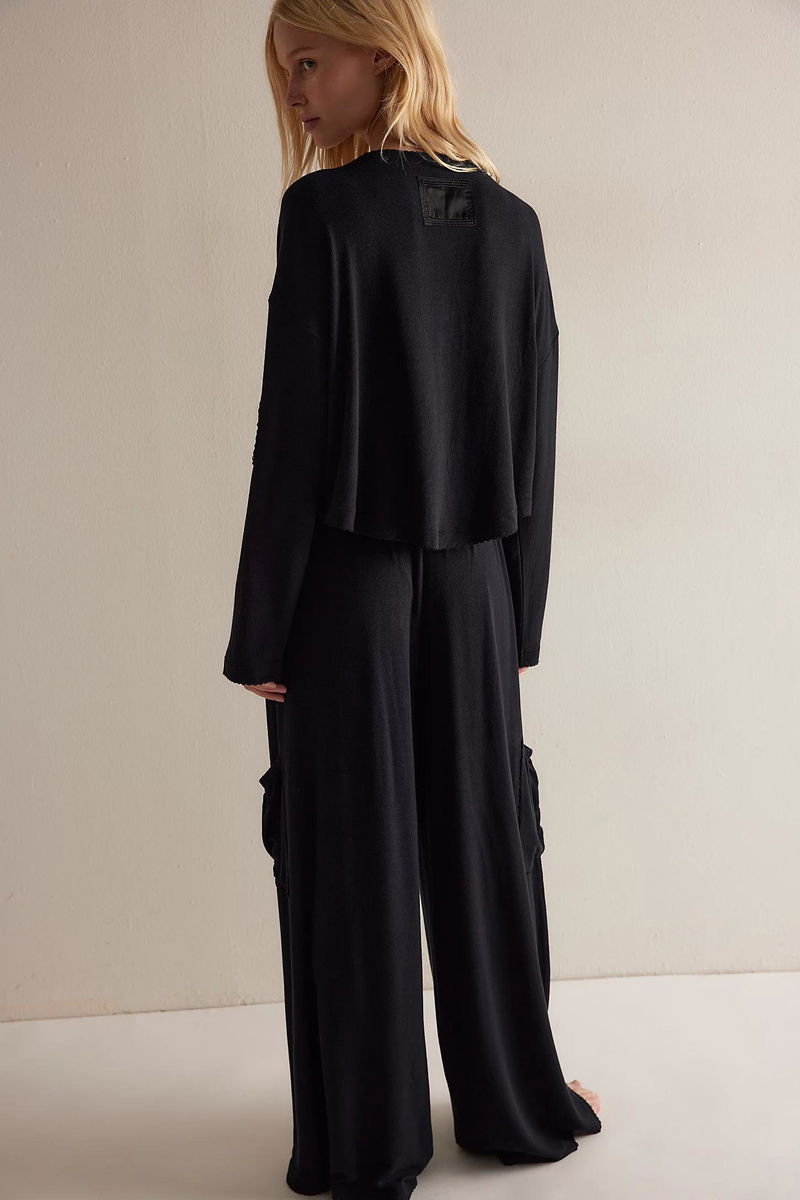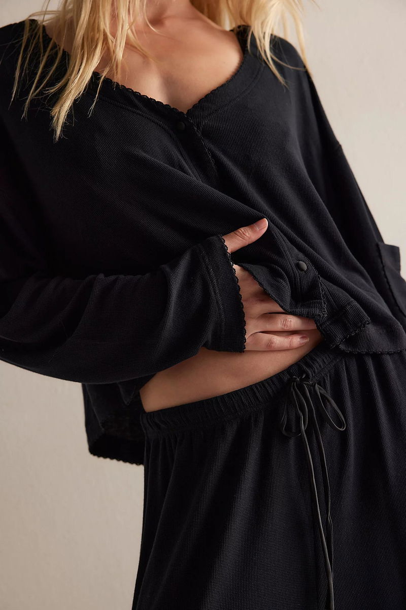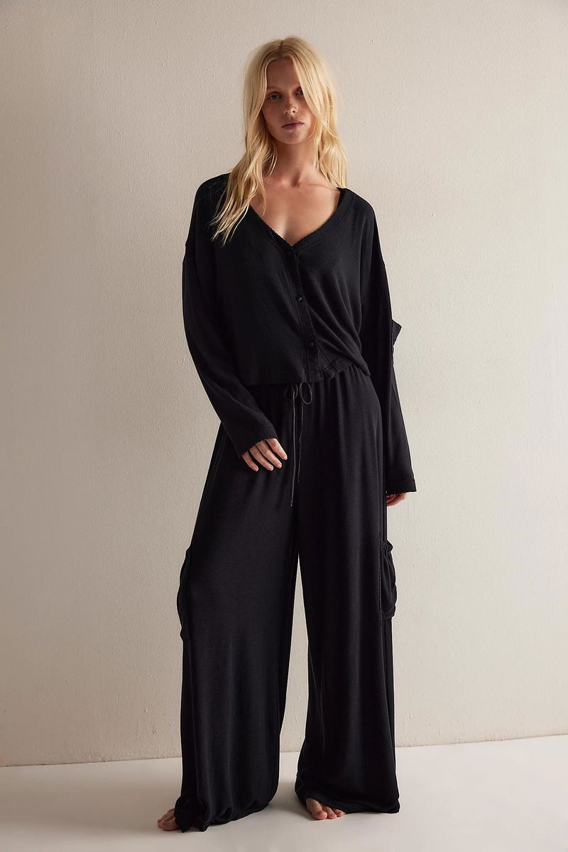 Slouchy silhouettes and super soft fabric make this lounge set from Intimately the perfect cozy addition to your sleep styles, featuring a thermal knit fabrication, a button-down top with drop shoulder sleeves, and elasticated, wide-leg pants with side patch pockets.