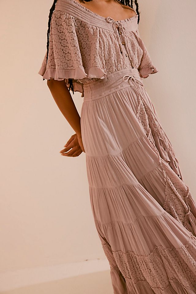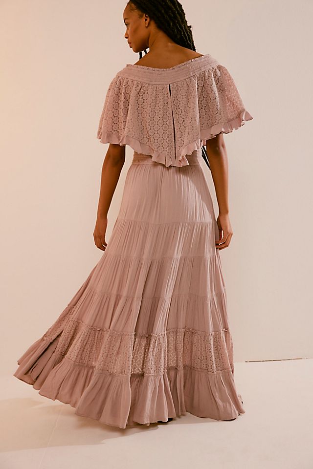 Romantic and ethereal, this sweet maxi from our free-est collection will turn heads with every wear. Billowy, A-line fit with cinched waistline. Scoop neckline with smocked trim, embroidered lace and ruffle trimming, tiered skirt design with exaggerated front vent, back cape sleeves. Elevated with strappy heels or off duty with beachy sandals, this style has endless ways to wear.