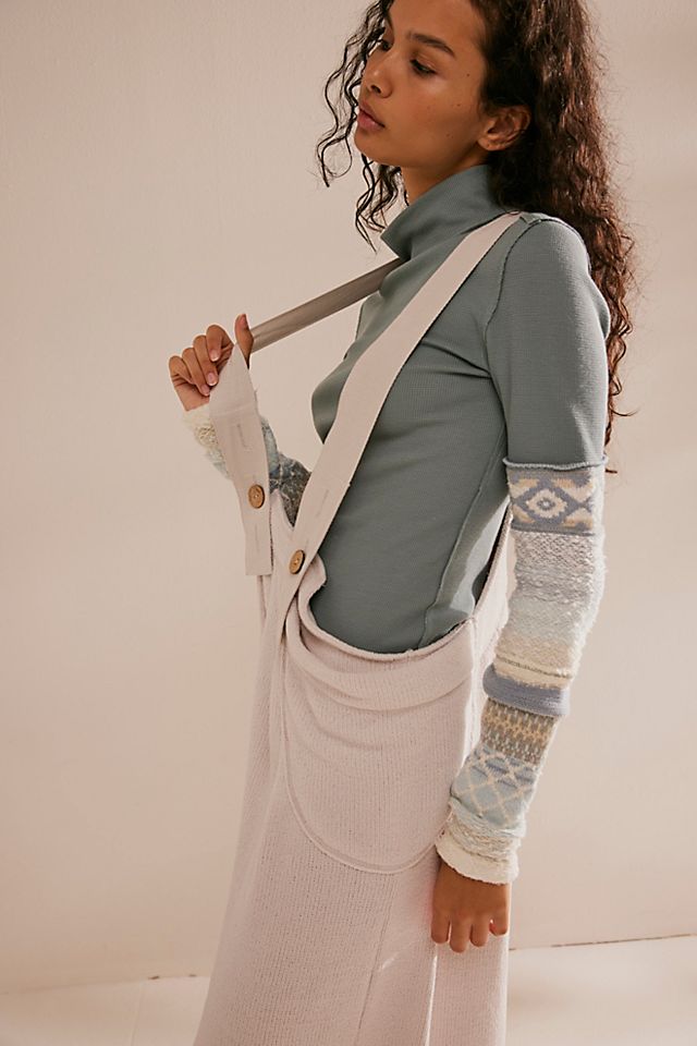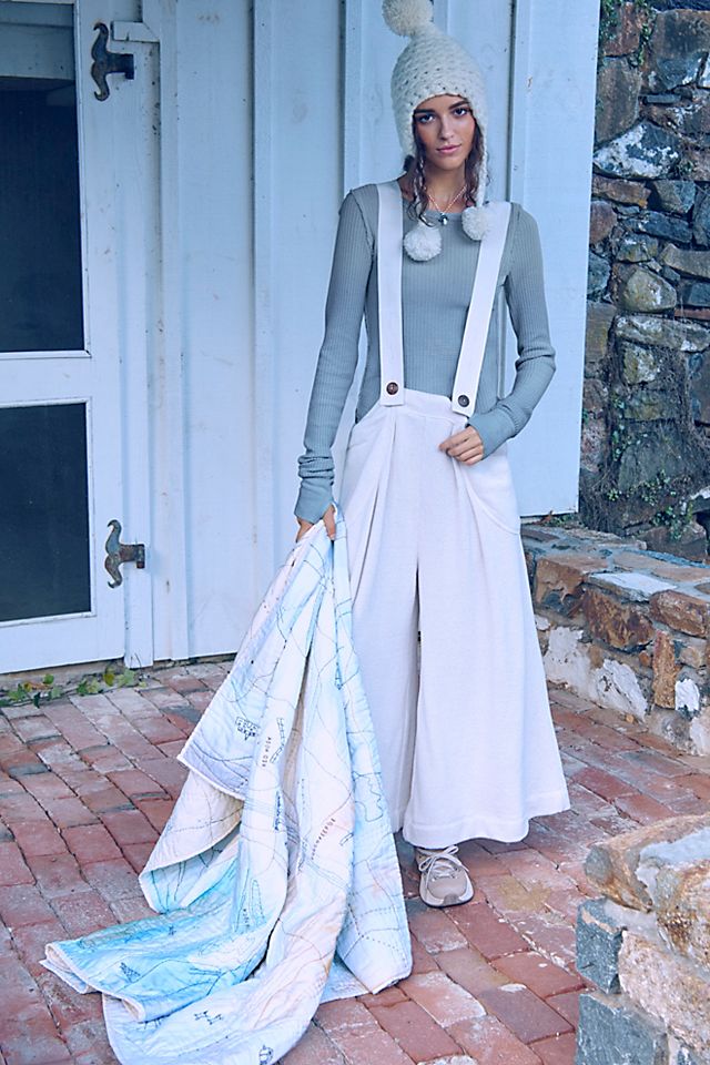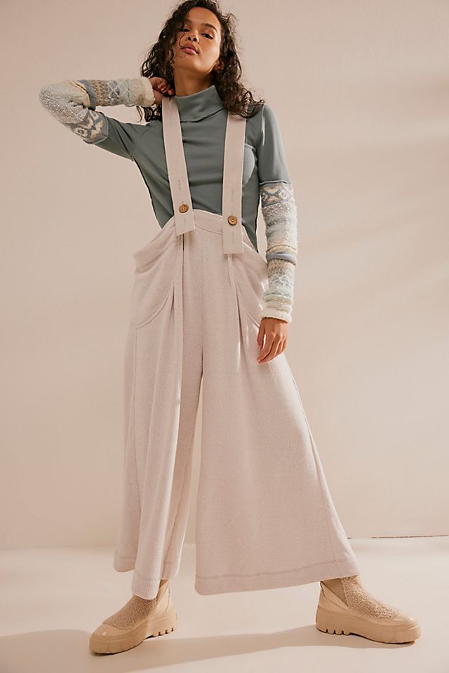 Breezy and effortless, these pinafore-inspired overalls from the free-est collection are the definition of versatile. High-rise, ultra wide-leg silhouette with slouchy straps. Exaggerated dropped armholes, side pouch pockets, cropped inseam, button closures at straps, soft knit fabrication.