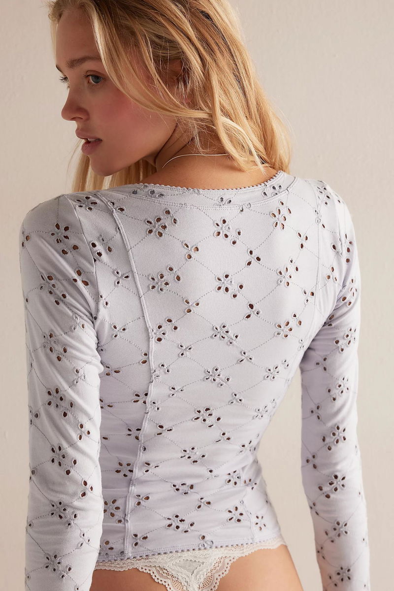 From our favorite eyelet collection, this long sleeve from Intimately features a soft cotton fabrication, picot trim, and seam details for the sweetest go-to style.