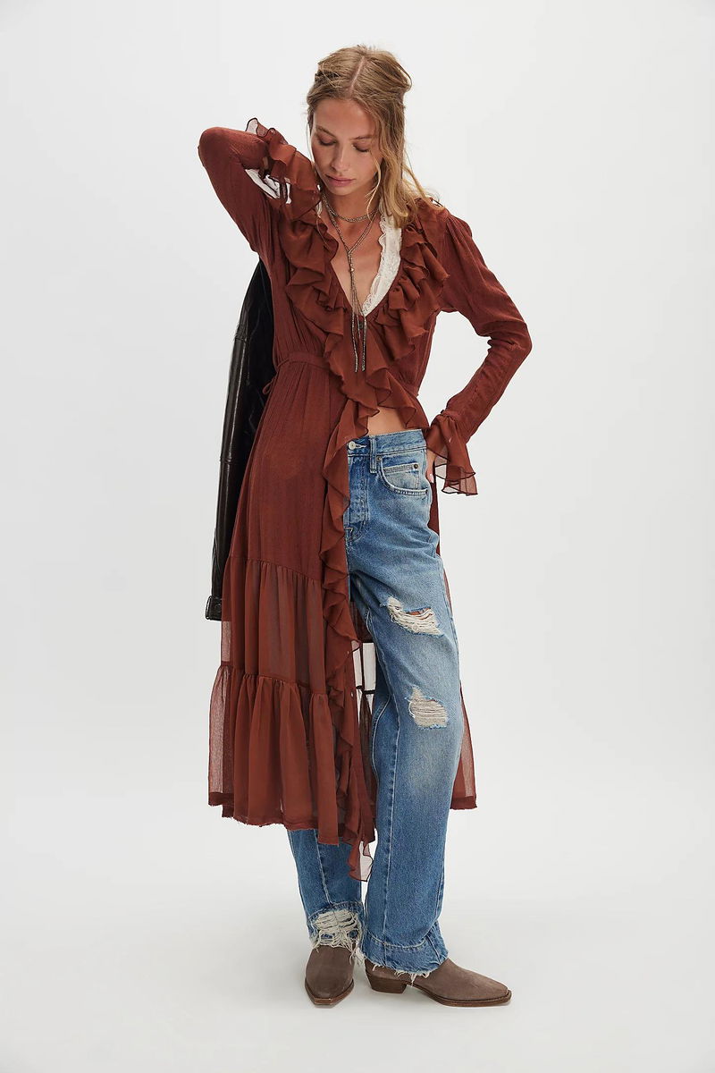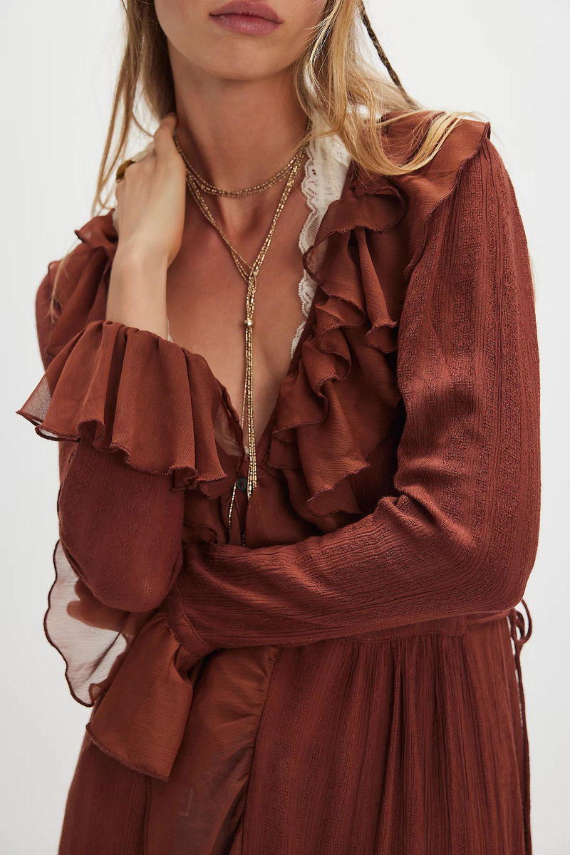 Effortless romance is yours with this ethereal long-sleeve midi dress, featuring a billowy A-line silhouette, airy semi-sheer fabrication, and ruffle detailing for an added touch of elegance.