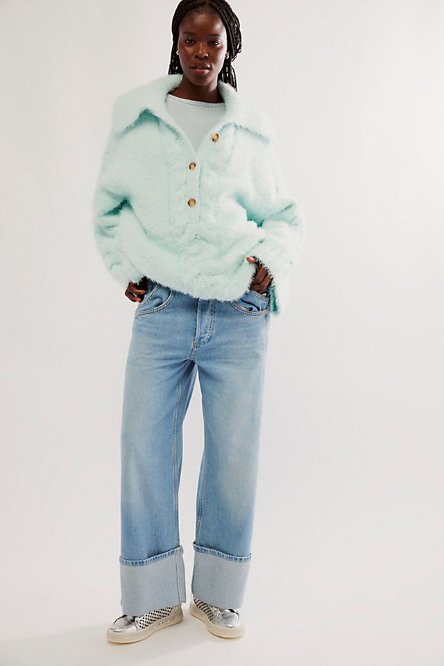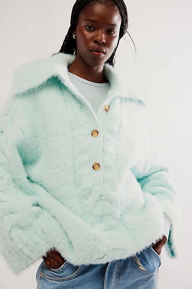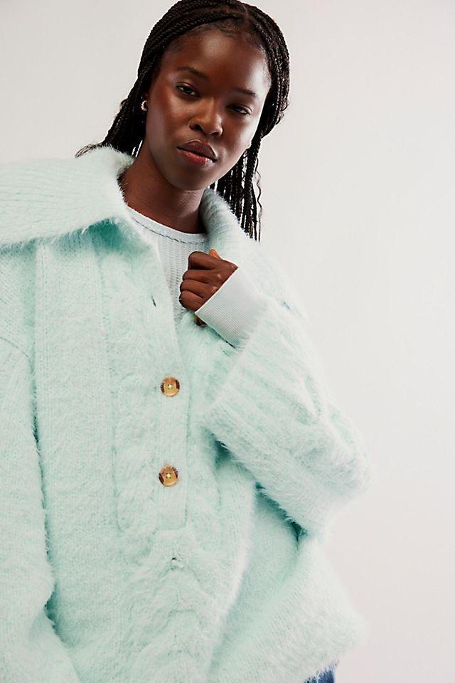 Cozy meets chic with this ultra-soft sweater, featured in a fuzzy knit fabrication and oversized fit with a collared neckline and cable knit detail throughout. Slouchy, oversized fit. Soft knit fabrication with a fuzzy feel, collared neckline, button-front detail, dropped sleeves, cable-knit detail throughout. Perfect layered over a tunic or paired with your favorite bottoms, this sweater can be worn to go from season to season.