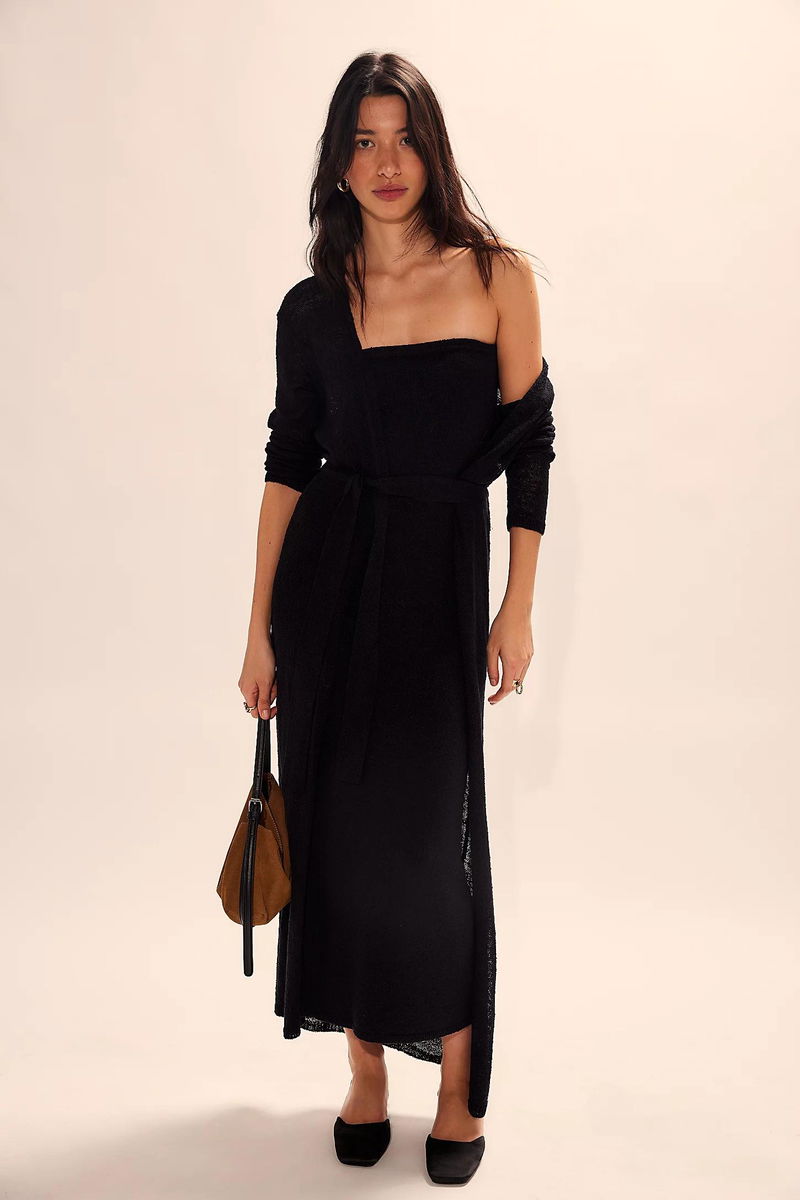 There are endless ways to wear this two-piece set from free-est, featuring a knit tube dress (that doubles as a column skirt) and a sweeping maxi cardi for the perfect elevated duo.