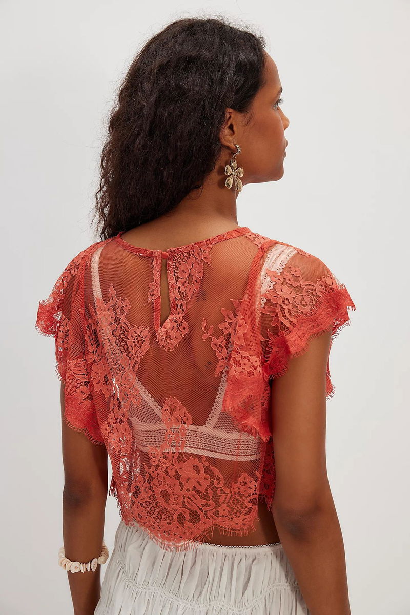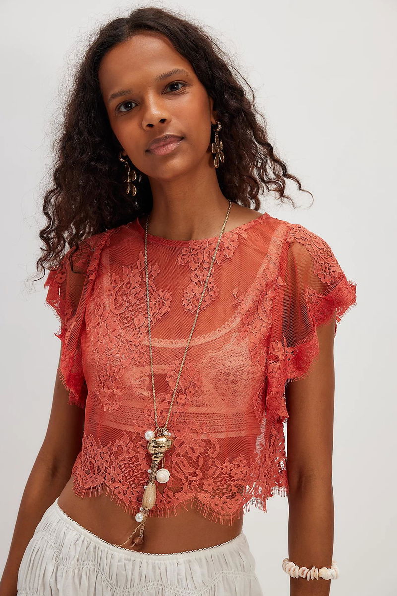 Fluttery sleeves and a billowy fit make this cropped lace top the perfect romantic option.