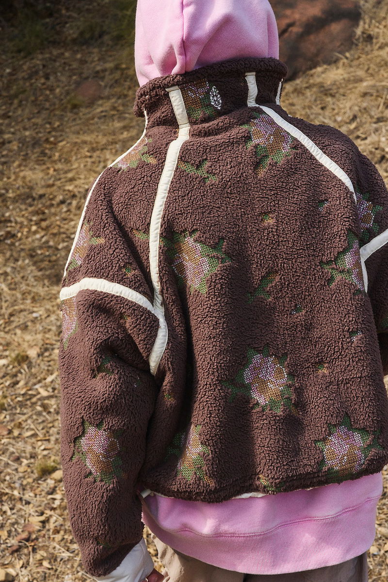 Cozy fleece pullover featuring a half-zip closure and high neckline with bold contrast seams throughout and beautiful embroidered floral detailing.