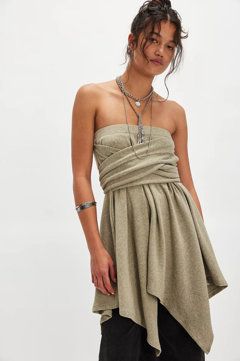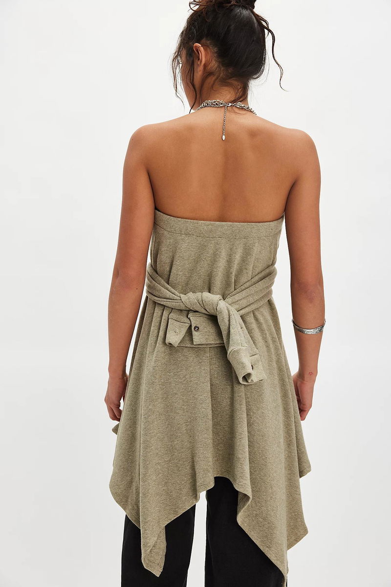 So cool and convertible, this effortless skirt features a wrap-inspired top with handkerchief bottom hem and sleeve-inspired tie at back for an added contemporary touch, perfect to style as a midi skirt or strapless shirt.