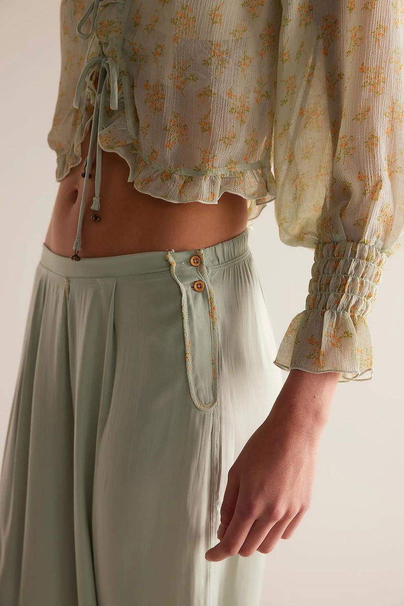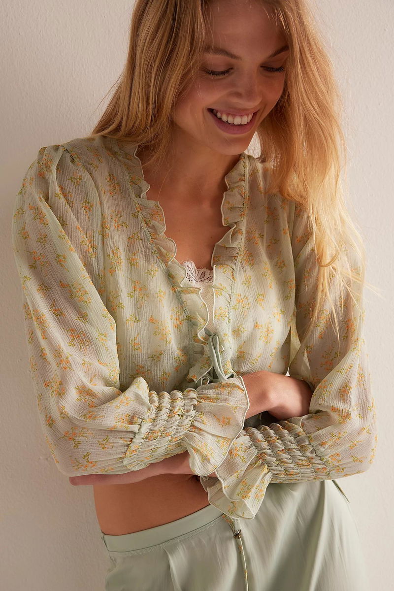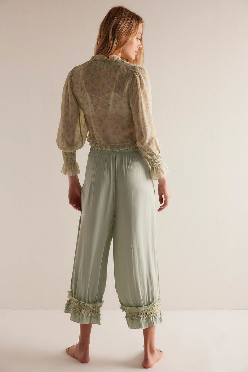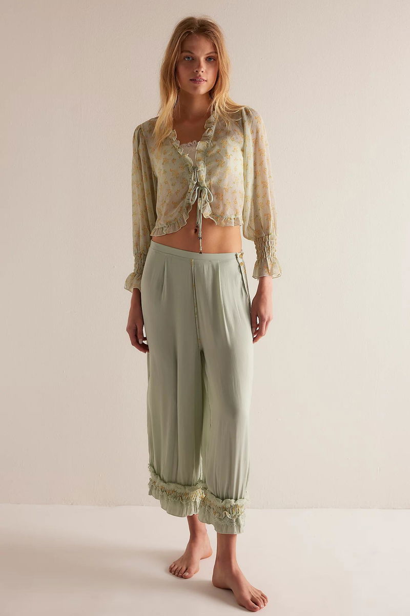 Romantic details adorn this lounge set from Intimately, featuring bloomer-style pants with delicately detailed trim and side buttons, plus a flowy, semi-sheer top with ruffled trim and dainty front ties.