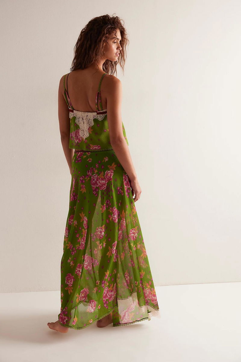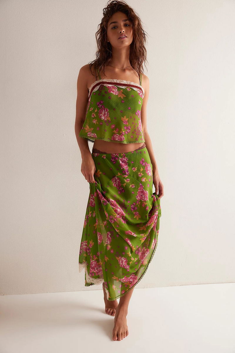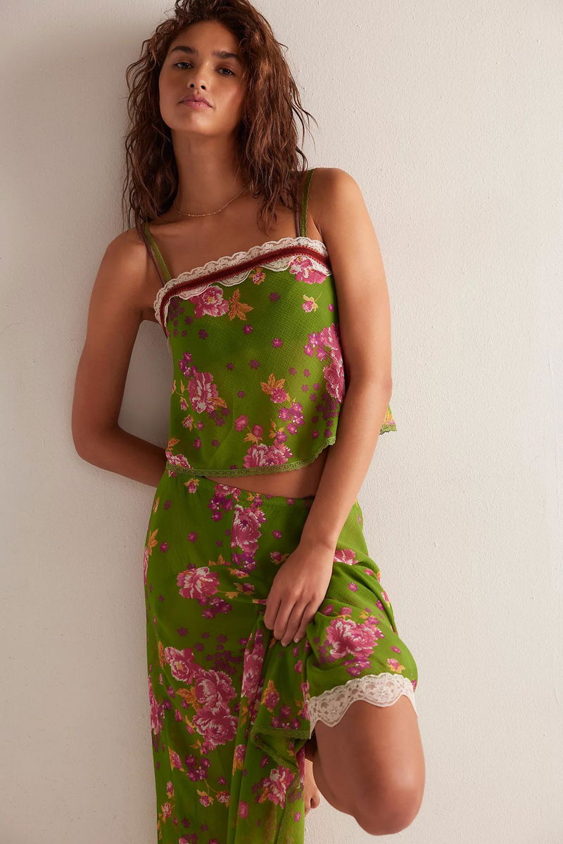 Ethereal florals and the loveliest color combos adorn this slip set from Intimately, featuring semi-sheer chiffon, a relaxed-fit top trimmed with velvet and lace, and a flowy skirt with an asymmetrical hem for a dreamily romantic style and vintage-inspired silhouette.