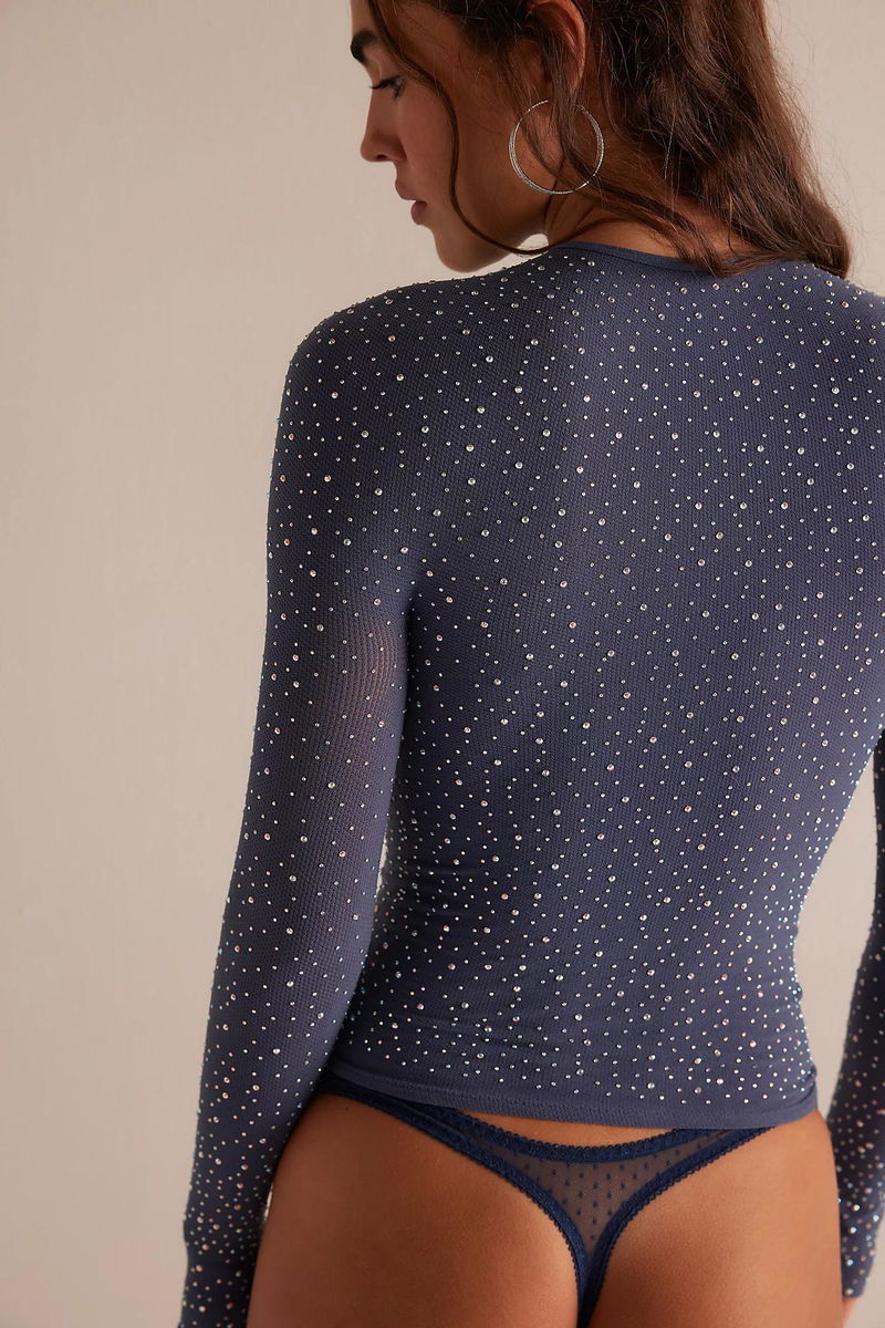 Glittering and gorgeous as a night sky, this long sleeve from Intimately adds a sparkling layer to your outfit, featuring a stretchy, lightweight fabrication and fitted sleeves with lettuce trim for a night-out-ready style.