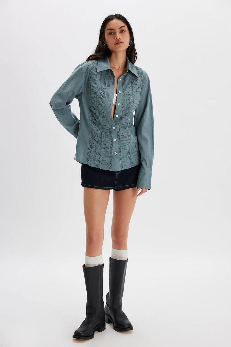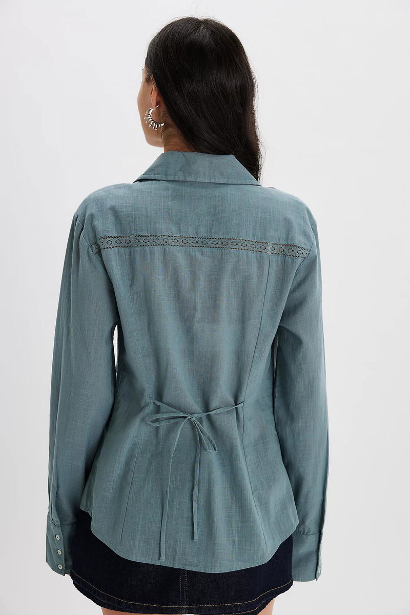 Thoughtfully tailored details make up this button-down, including cotton fabrication, sheer lace inserts, ruffled panels, and a back tie detail for a forever flattering fit.