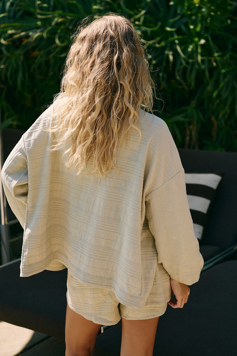 Transition-season dressing has met its match–this set from free-est features a unique, wrap-style short and a button-down long sleeve in a breezy textured cotton fabrication for the perfect beachy twist.
