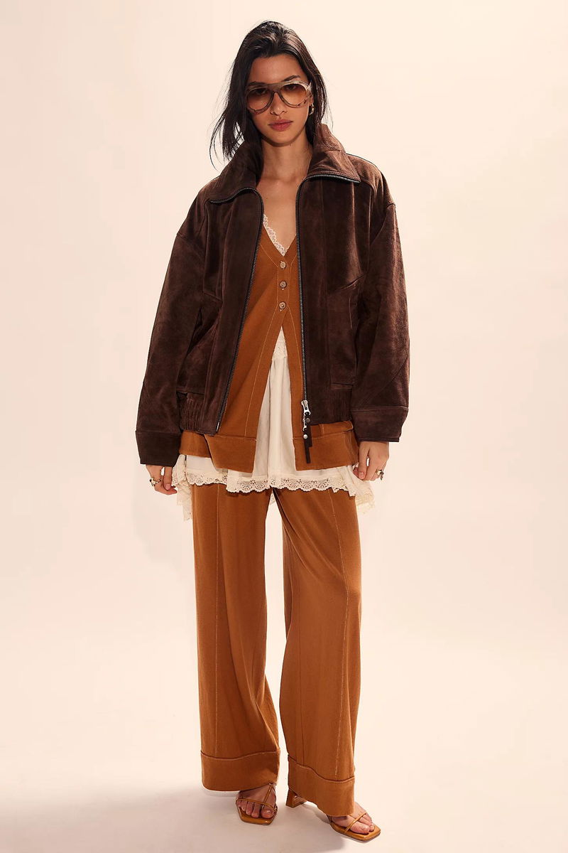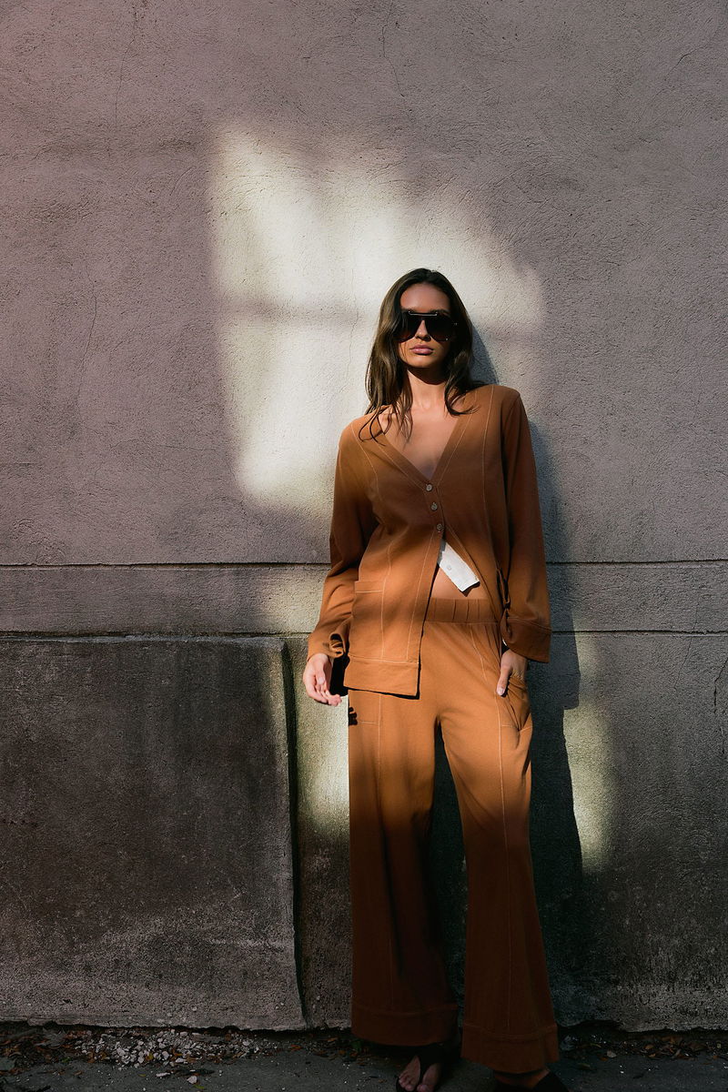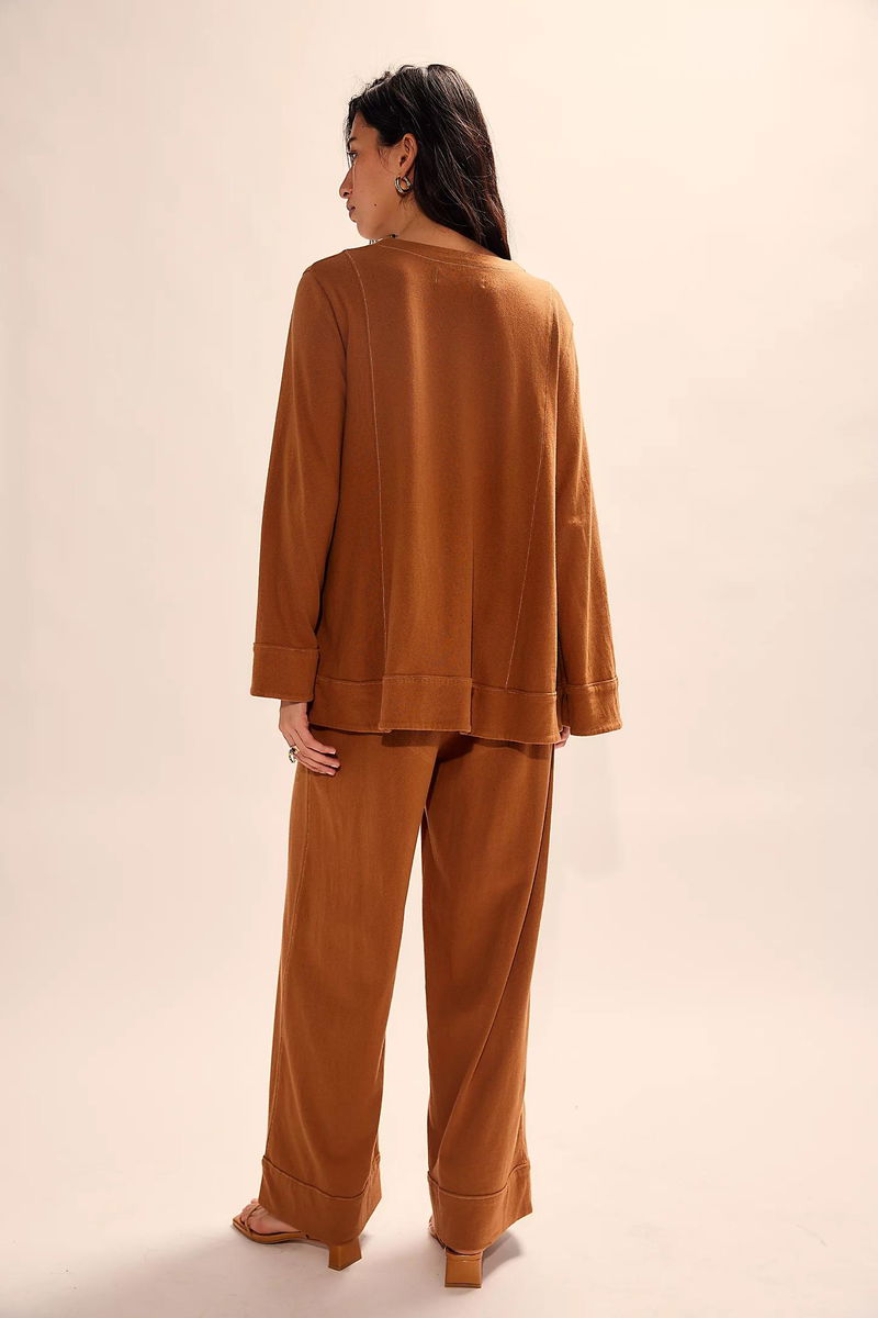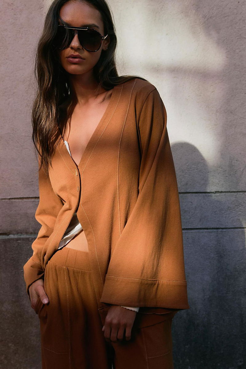 A new addition to a most-loved collection. Ready for cooler temps, this set from free-est features a flyaway-style cardigan and wide-leg pants in a heavy cotton jersey with distinct stitching for our signature Strada look.